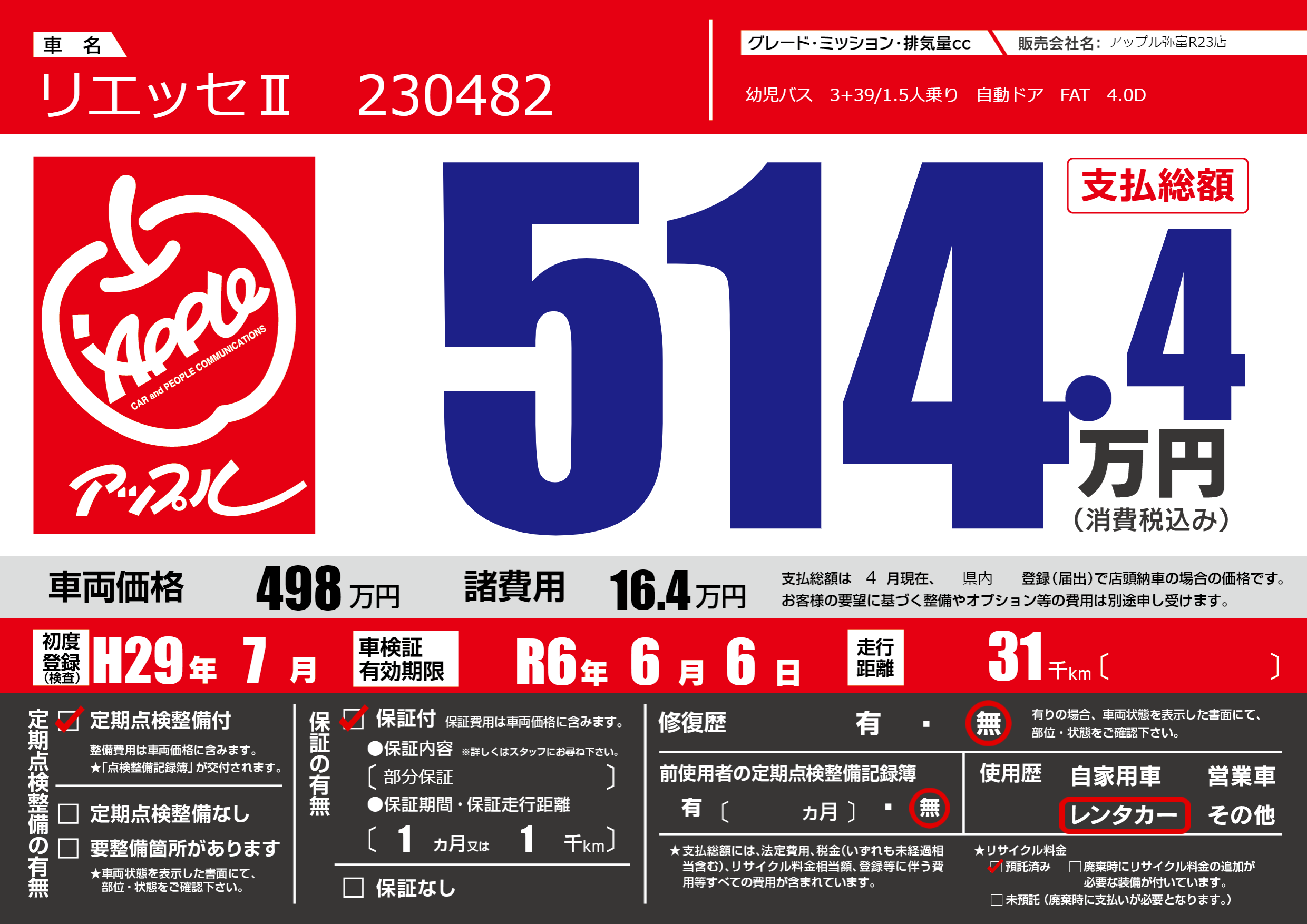 | 車名 | リエッセⅡ 230482 | グレード ミッション 排気量 |