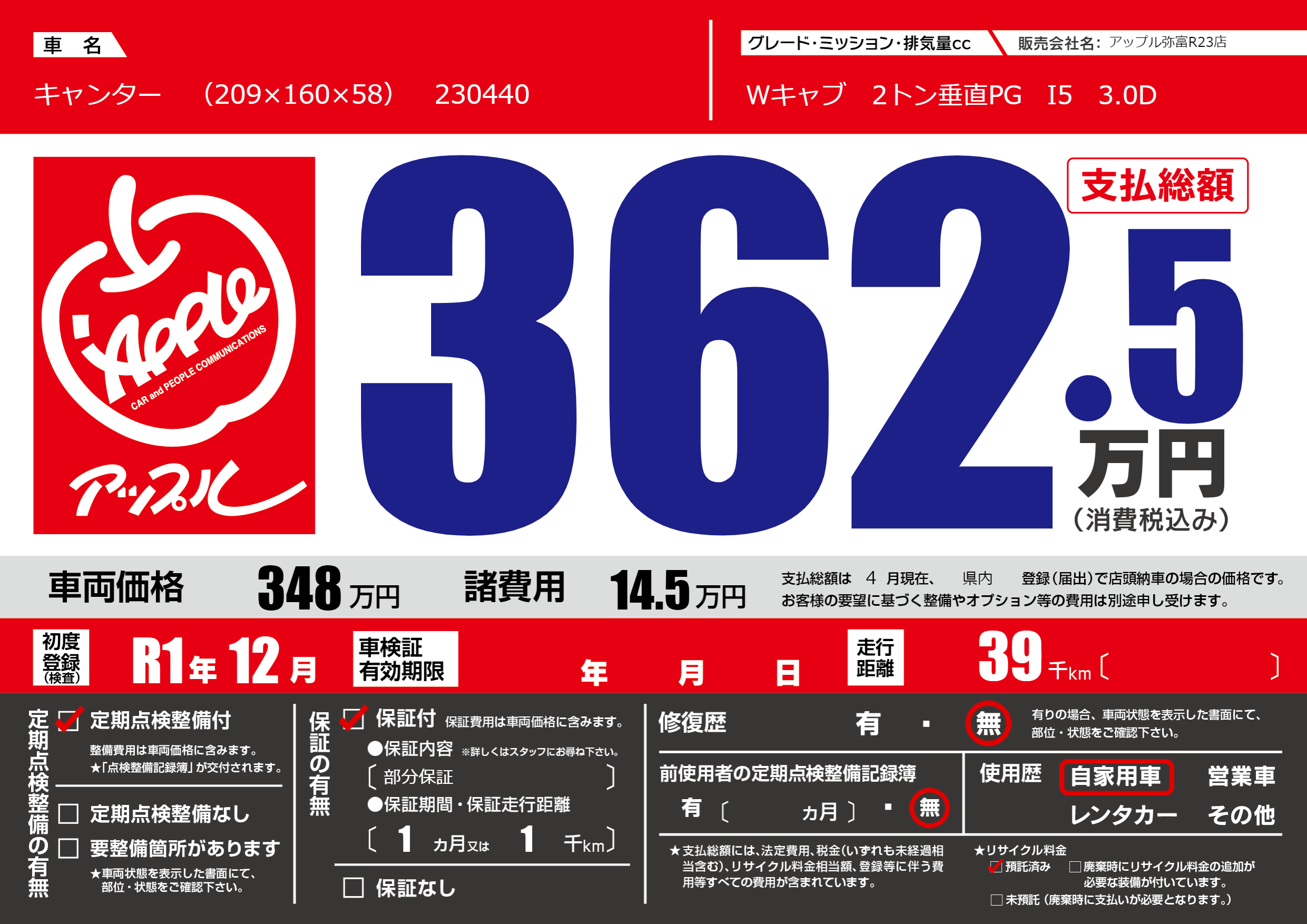 | 車名 | キャンター (209×160×58) 230440 | グレード ミッション 排気量 |