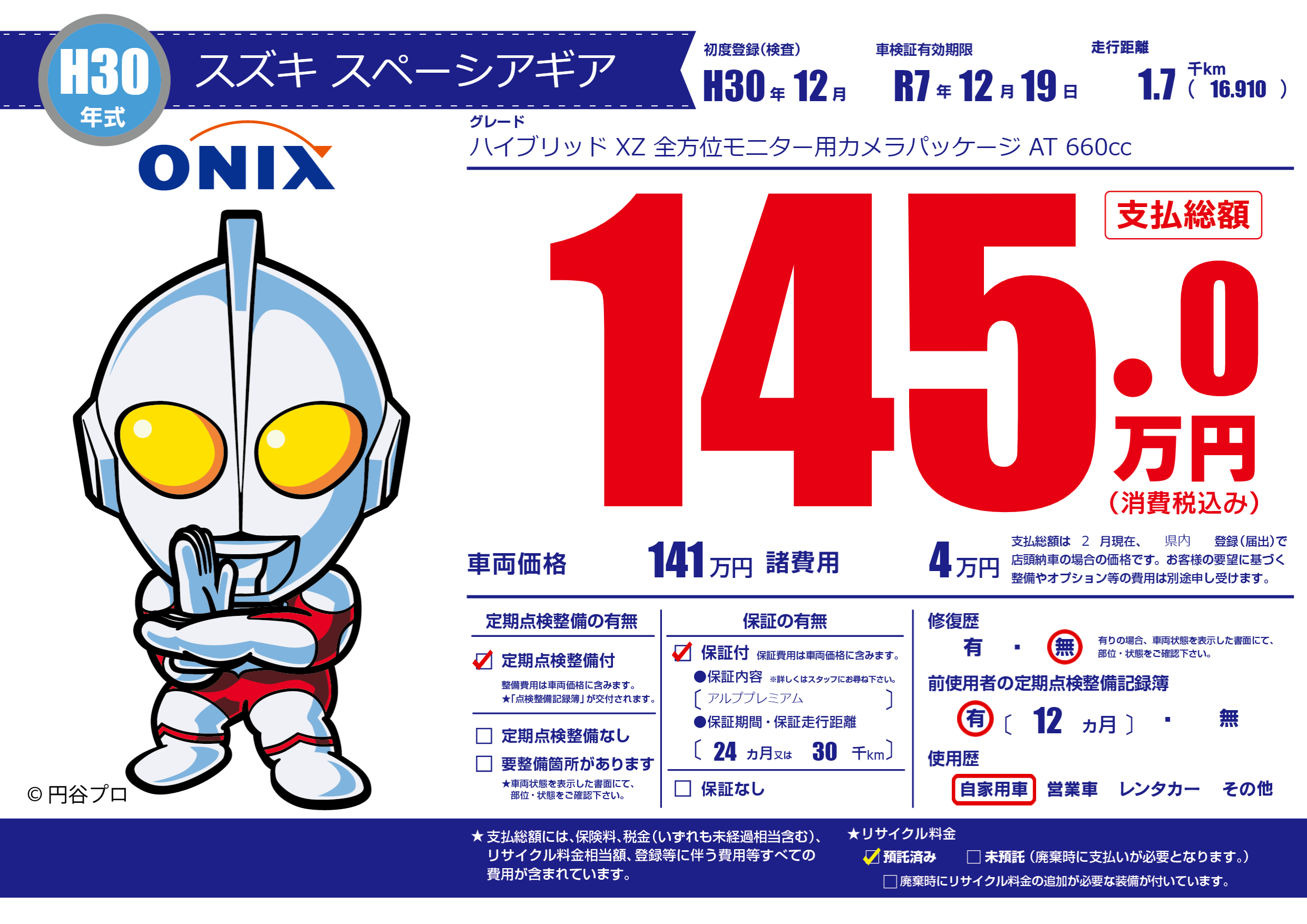 | 車名 | スズキ スペーシアギア | グレード ミッション 排気量 |