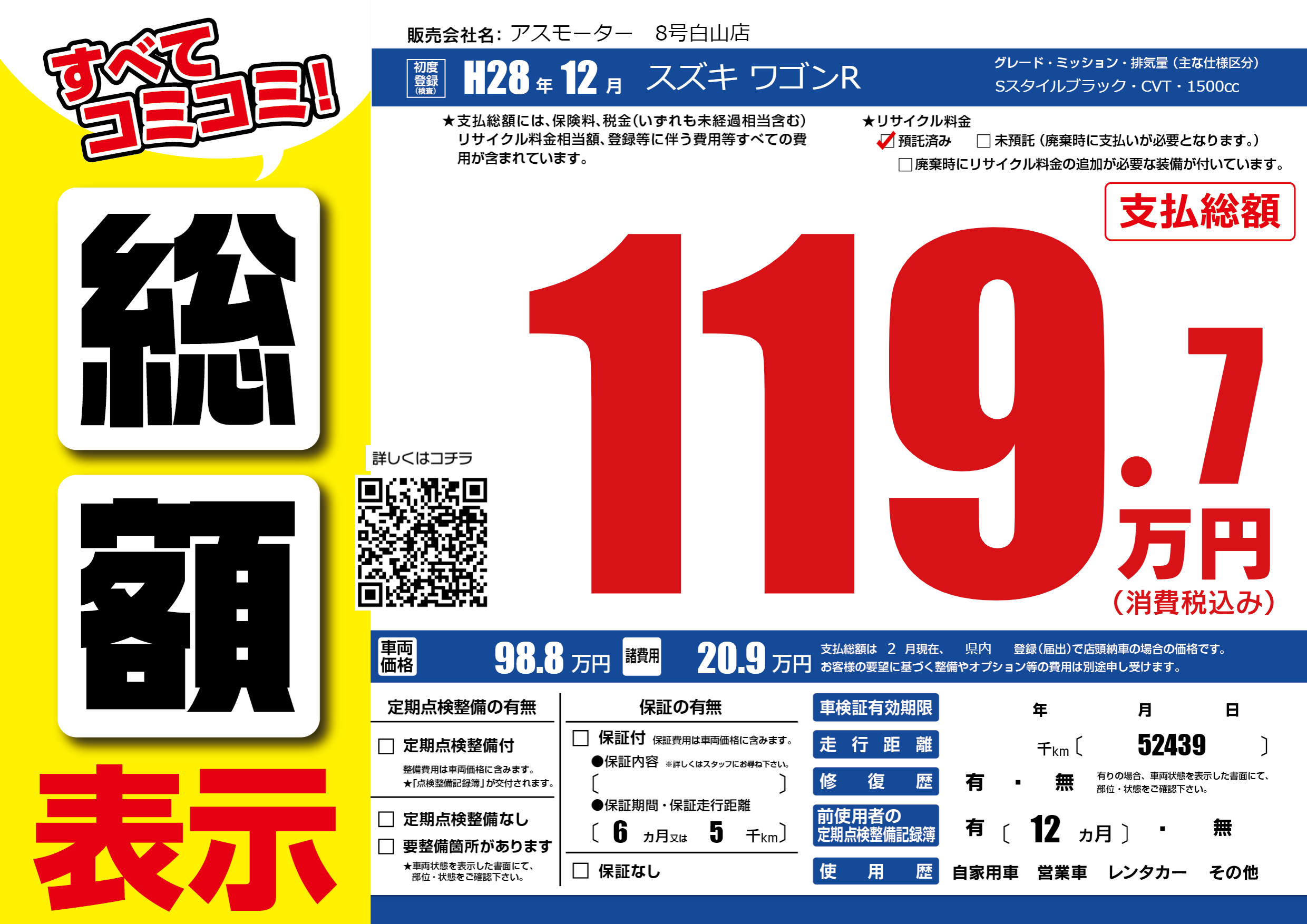 | 車名 | スズキ ワゴンR | グレード ミッション 排気量 |