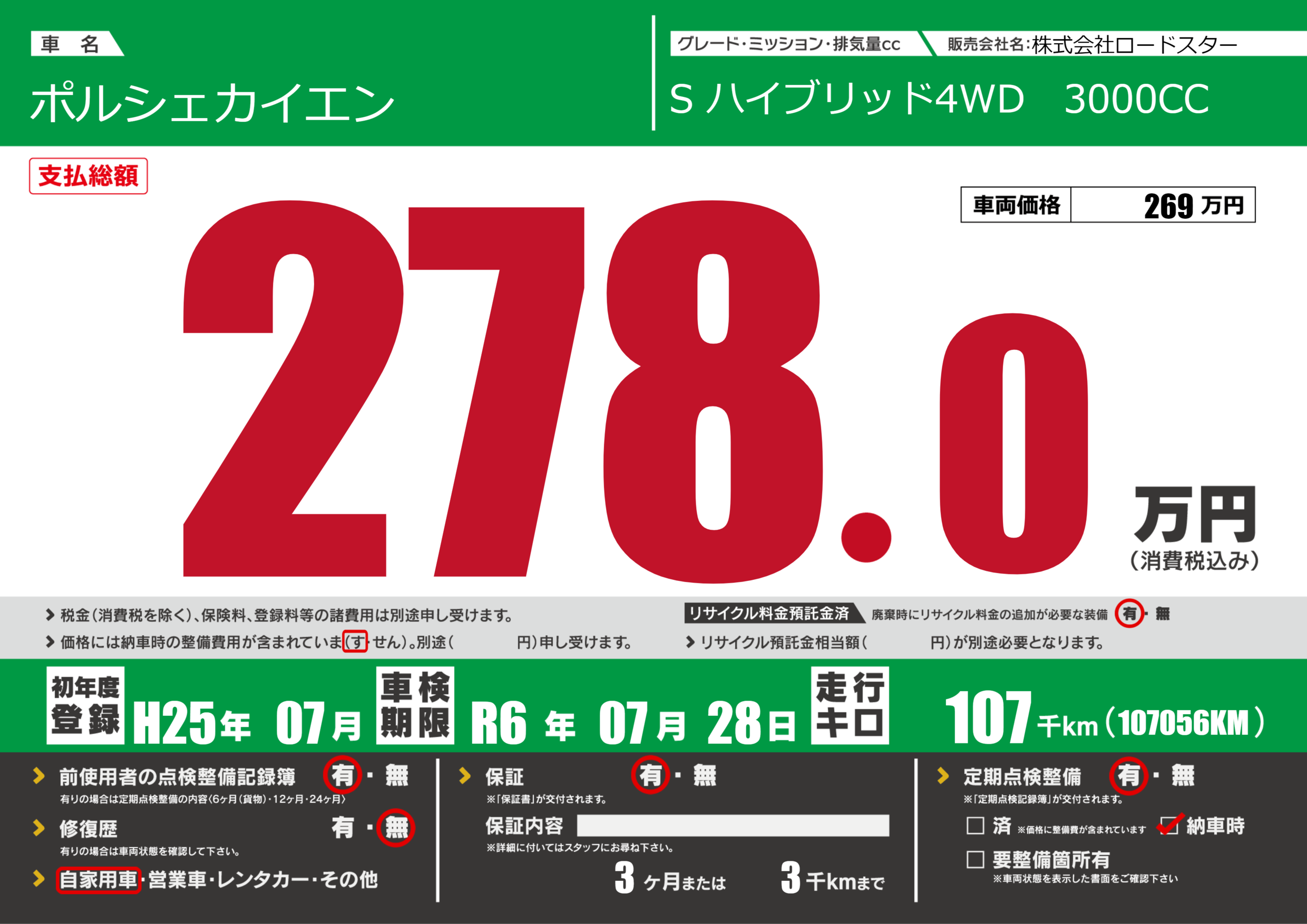 | 車名 | ポルシェカイエン | グレード ミッション 排気量 |