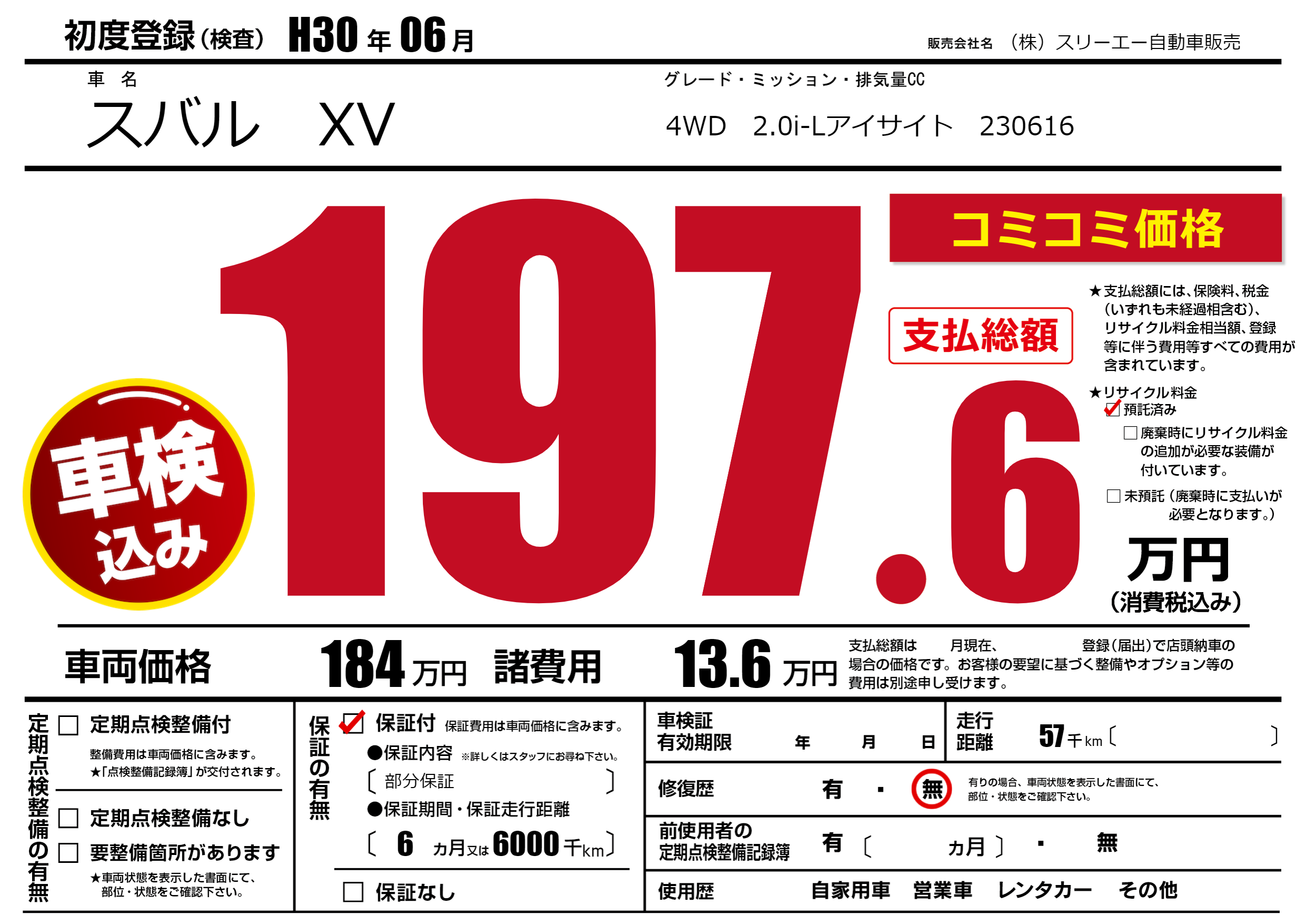 | 車名 | スバル XV | グレード ミッション 排気量 |