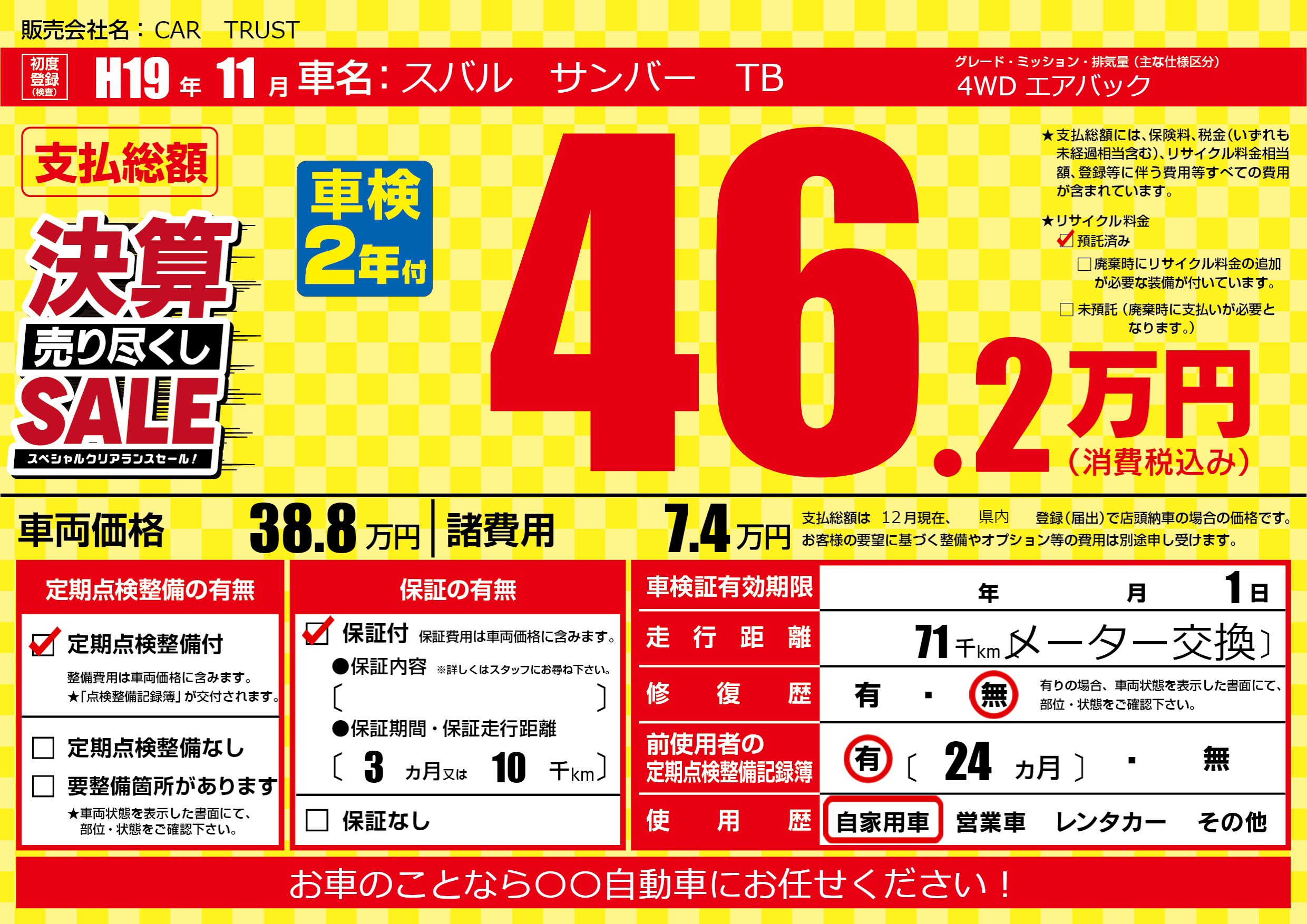 保証付き 保証内容(---) 3ヶ月または(10)千kmまで |