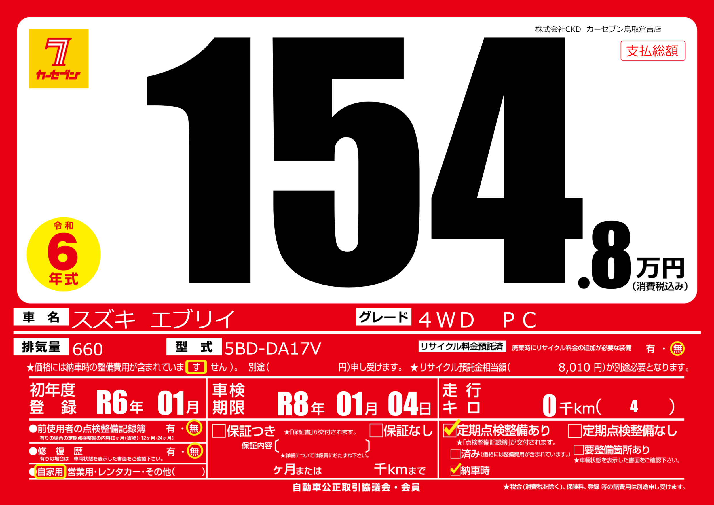 | 走行キロ | - | 初年度登録 | R6年01月 |