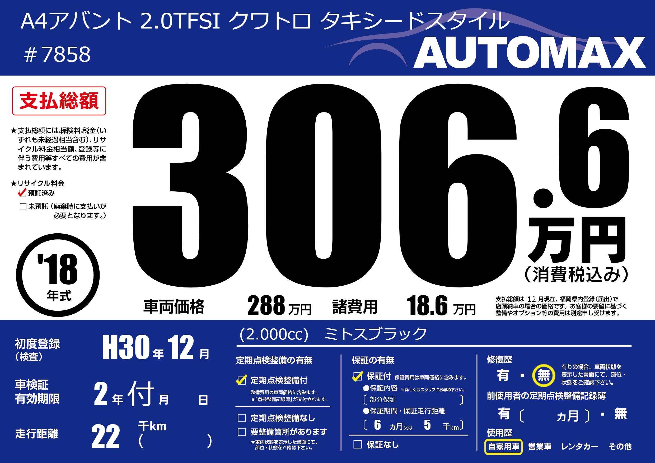 | 車名 | A4アバント 2.0TFSI クワトロ タキシードスタイル | グレード ミッション 排気量 |