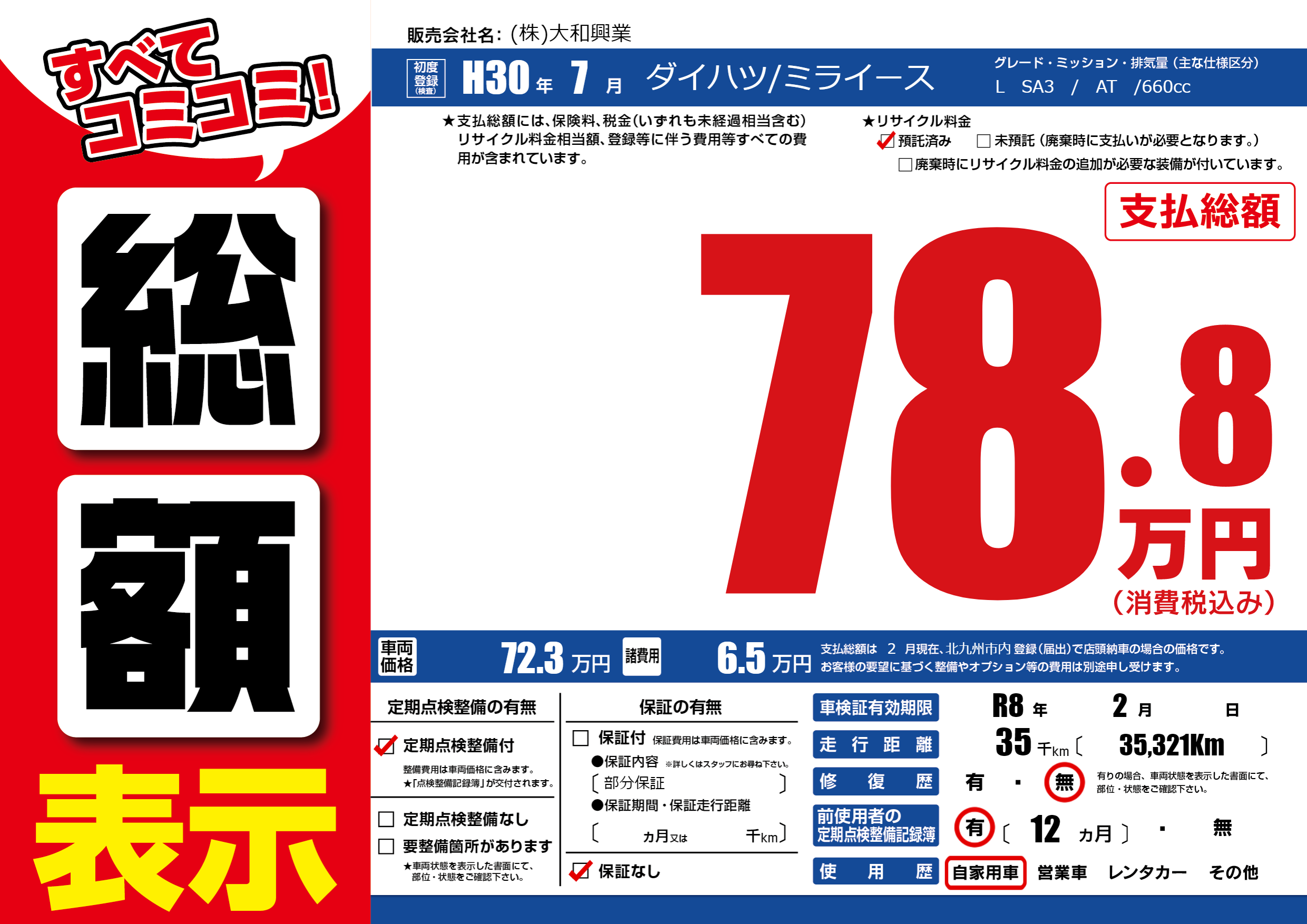 保証なし 保証内容(部分保証) ---ヶ月または()千kmまで |