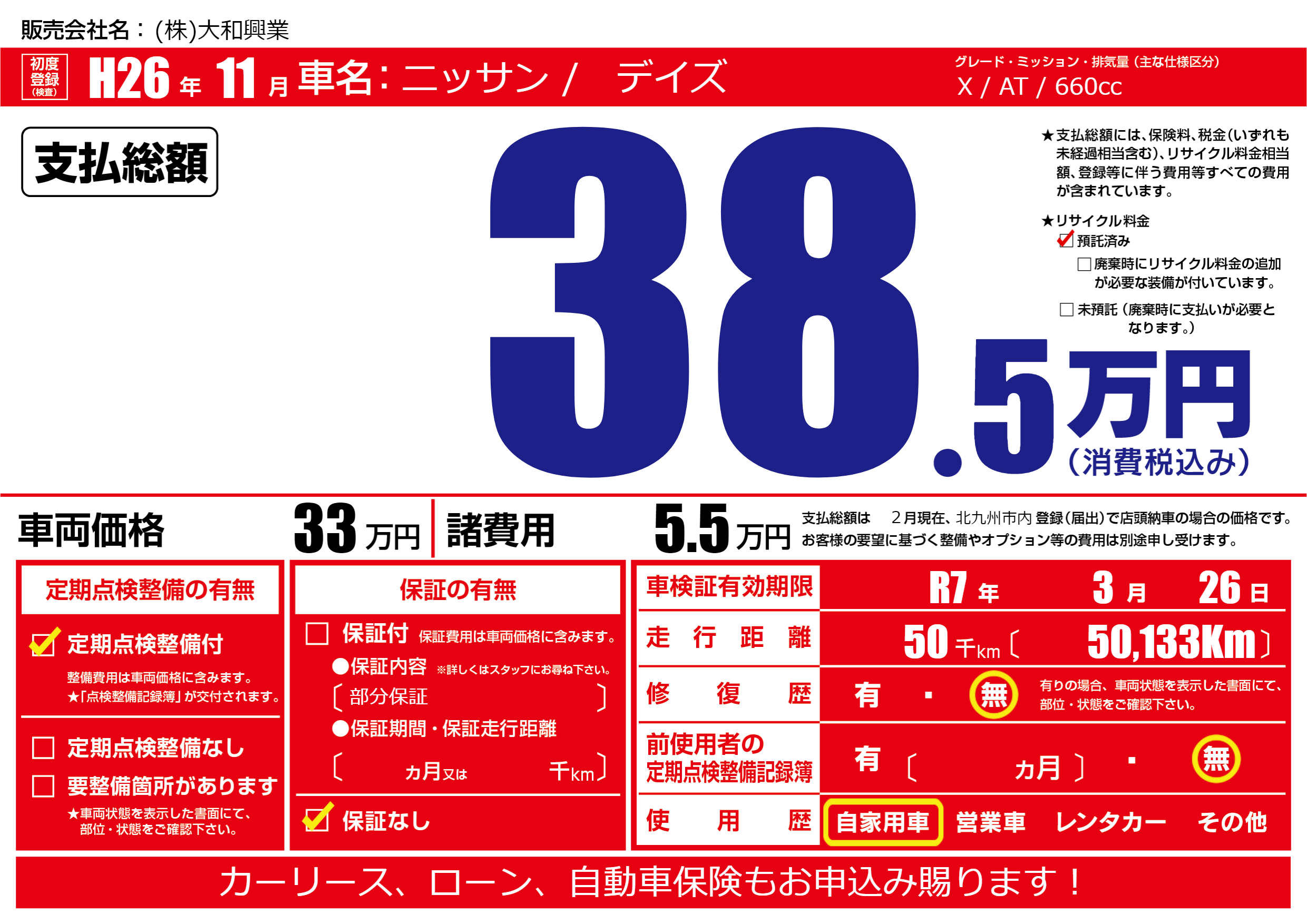 | 走行キロ | 5万km | 初年度登録 | H26年11月 |
