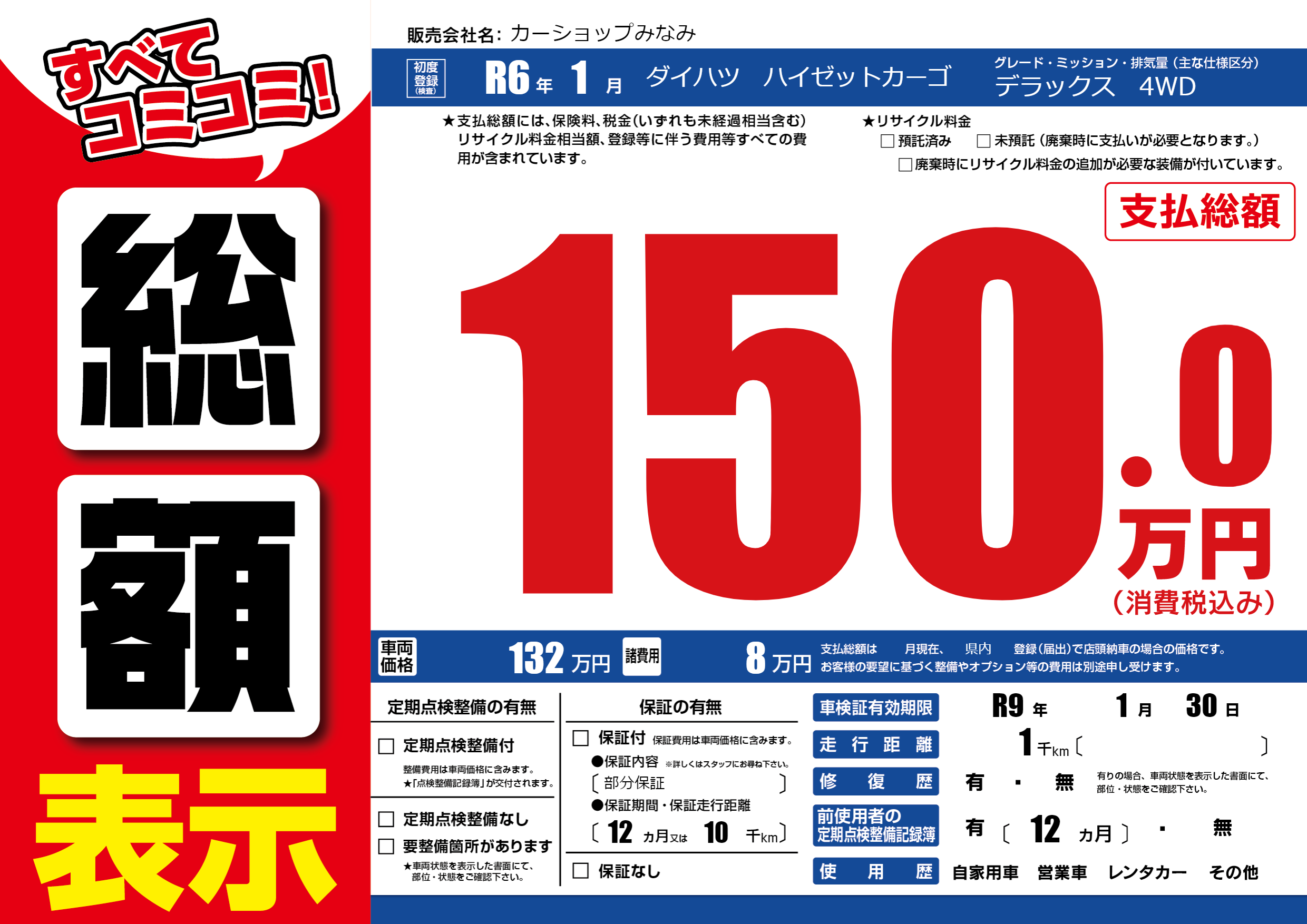 | 車名 | ダイハツ ハイゼットカーゴ | グレード ミッション 排気量 |