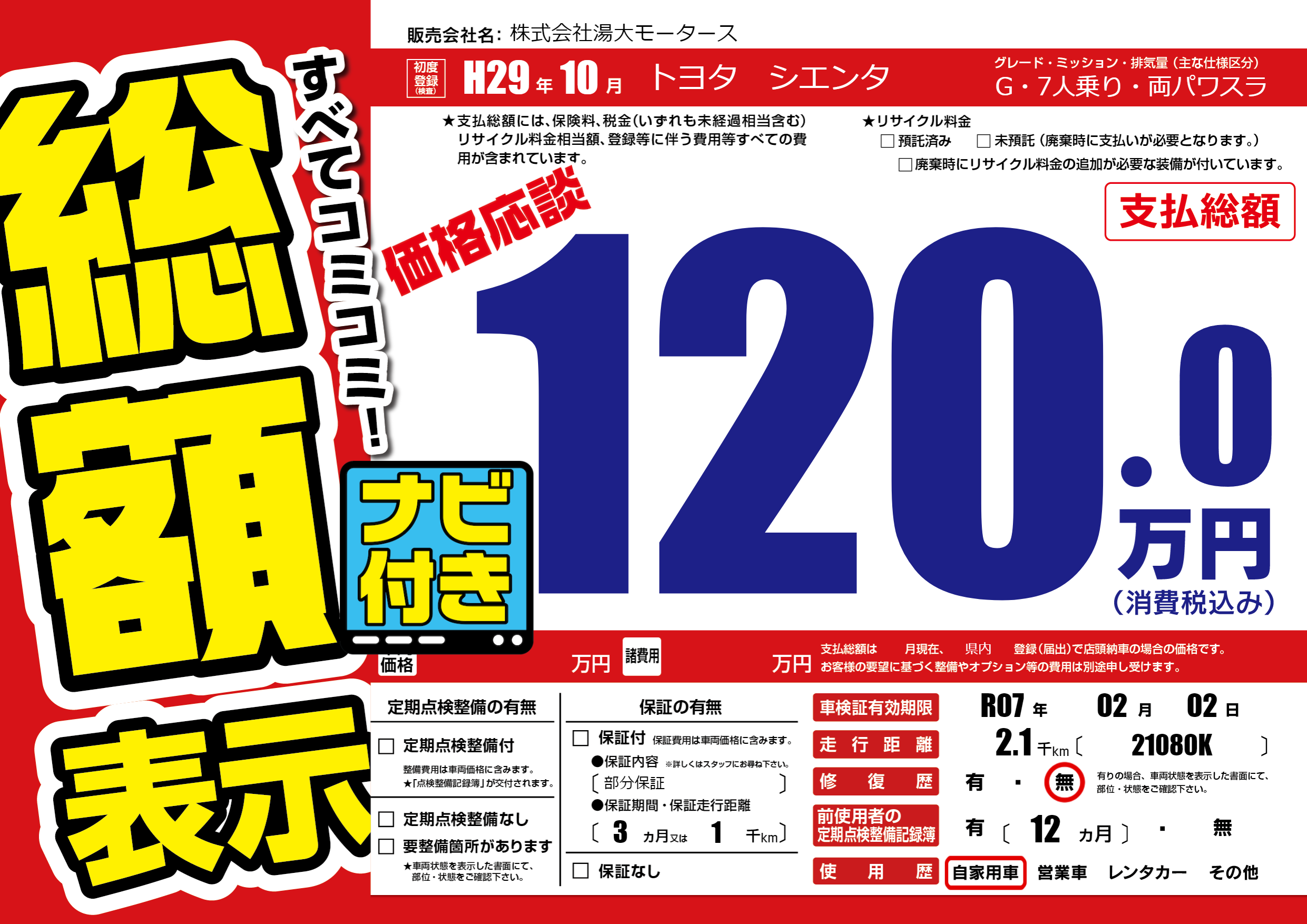 | 車名 | トヨタ シエンタ | グレード ミッション 排気量 |
