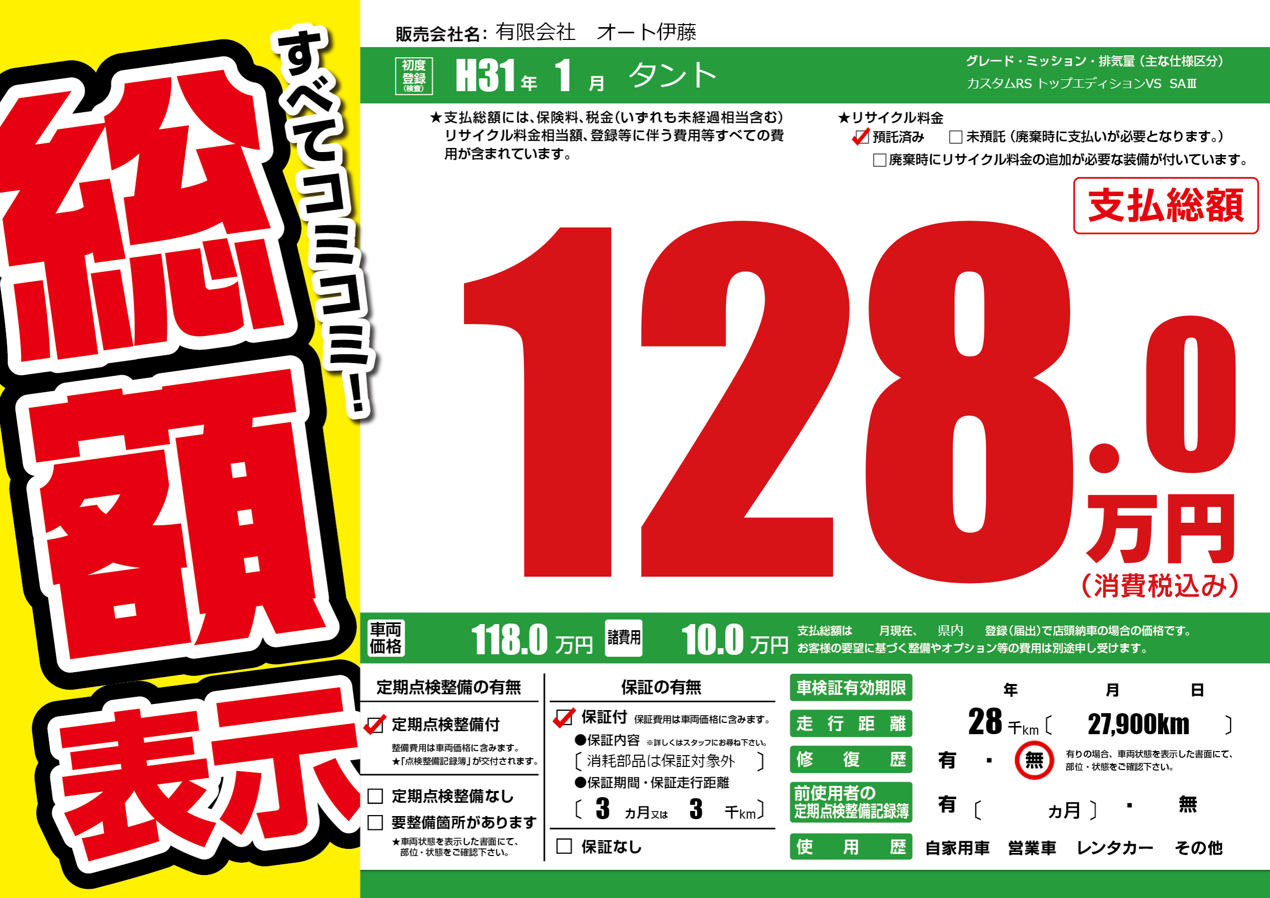 保証付き 保証内容(消耗部品は保証対象外) 3ヶ月または(3)千kmまで |