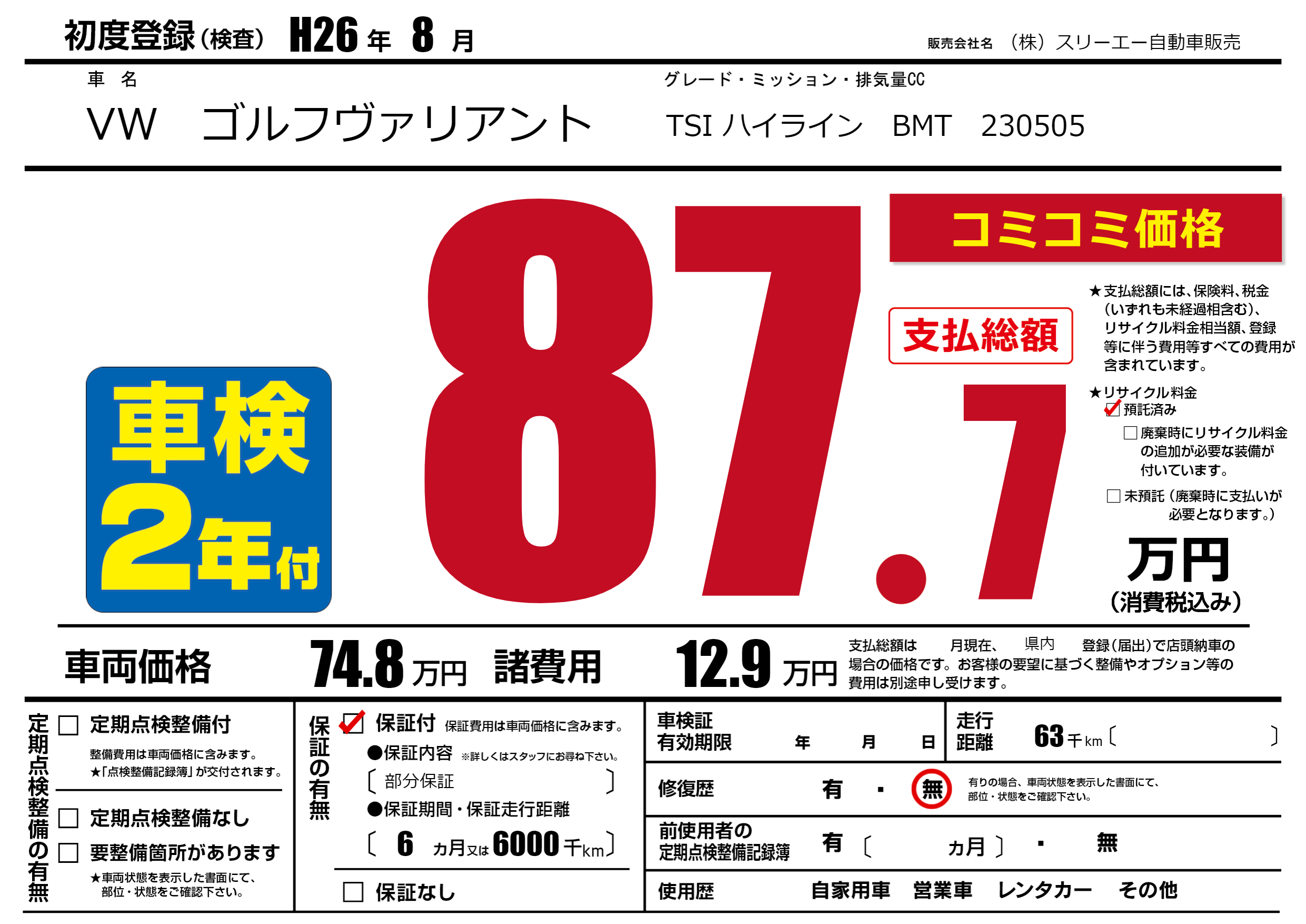 | 車名 | VW ゴルフヴァリアント | グレード ミッション 排気量 |