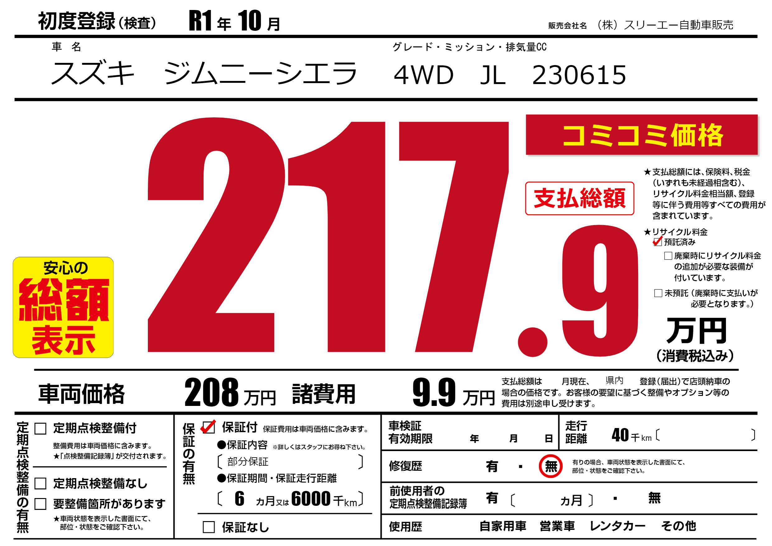 保証付き 保証内容(部分保証) 6ヶ月または(6000)千kmまで |