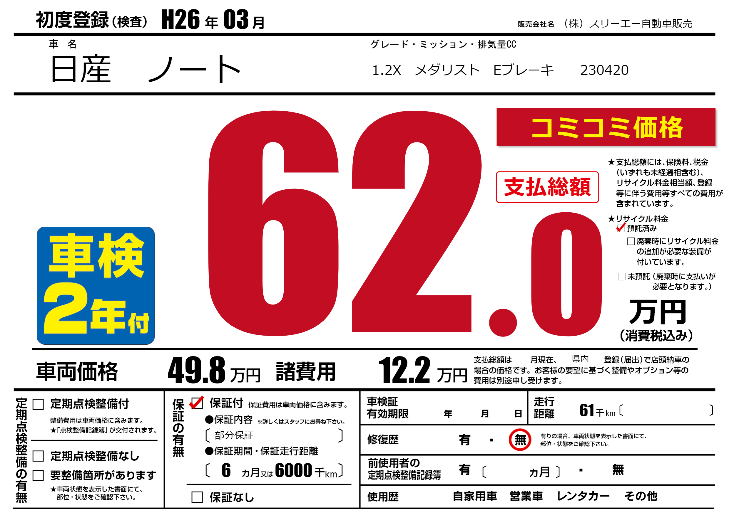 保証付き 保証内容(部分保証) 6ヶ月または(6000)千kmまで |