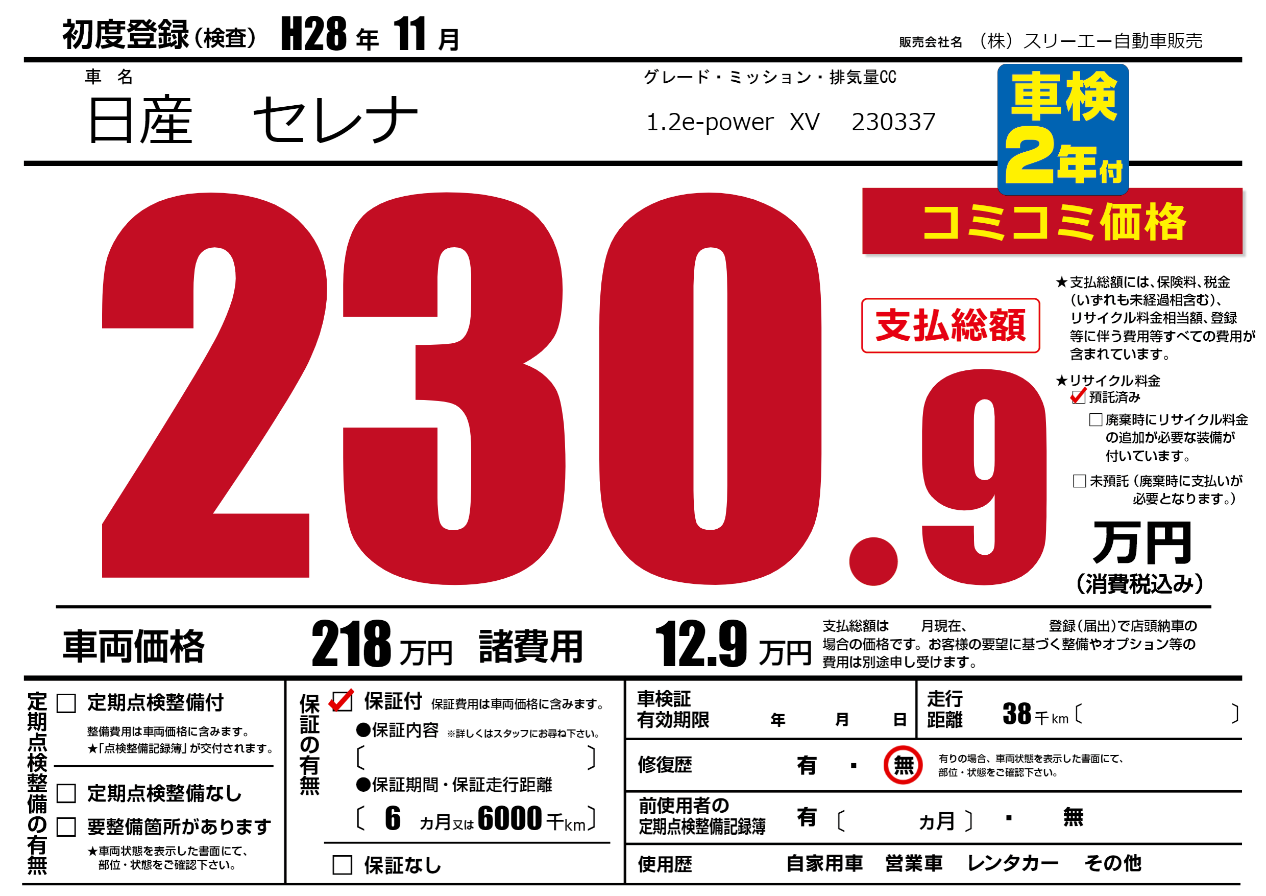 | 走行キロ | 3.8万km | 初年度登録 | H28年11月 |
