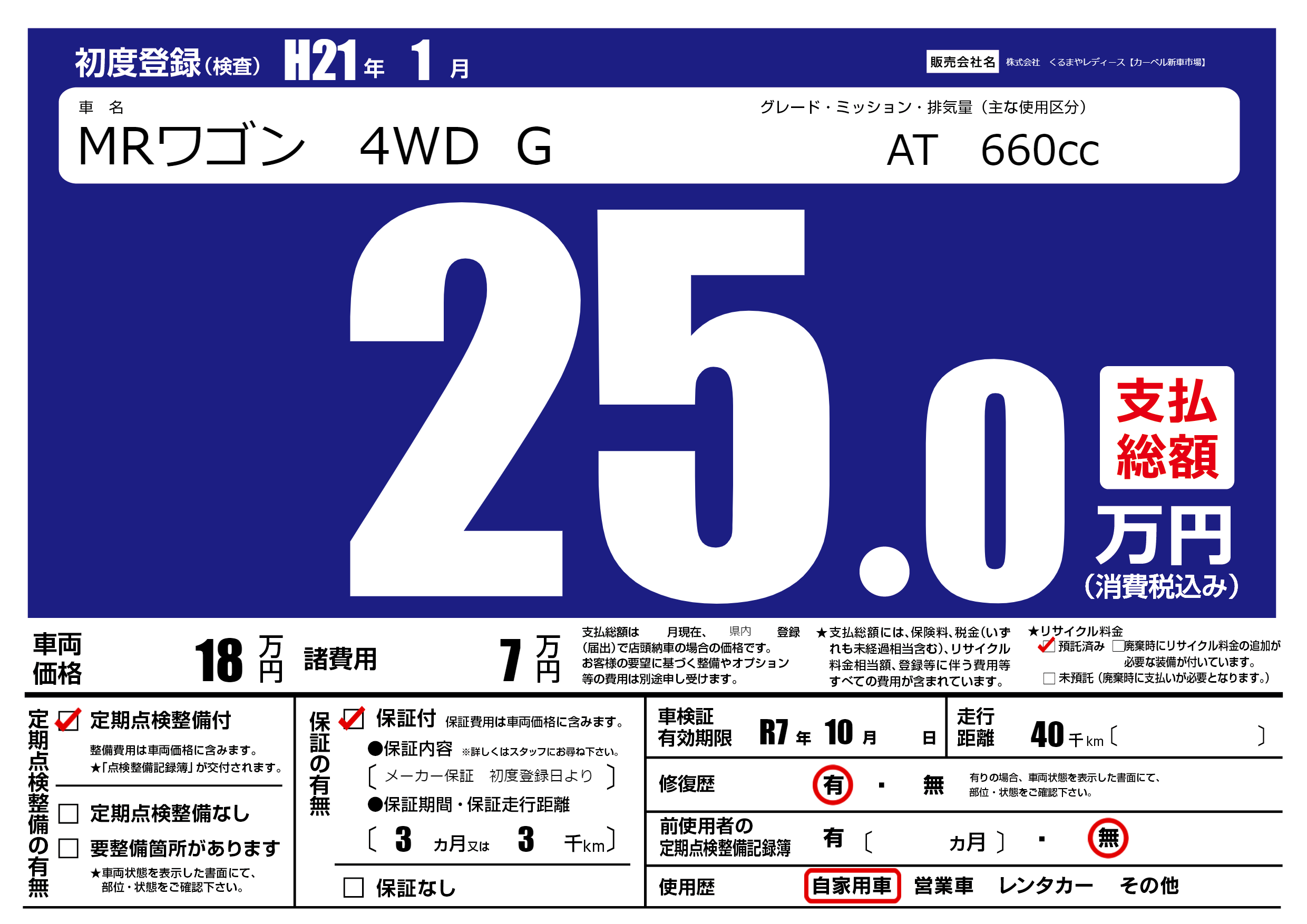 | 走行キロ | 4万km | 初年度登録 | H21年1月 |