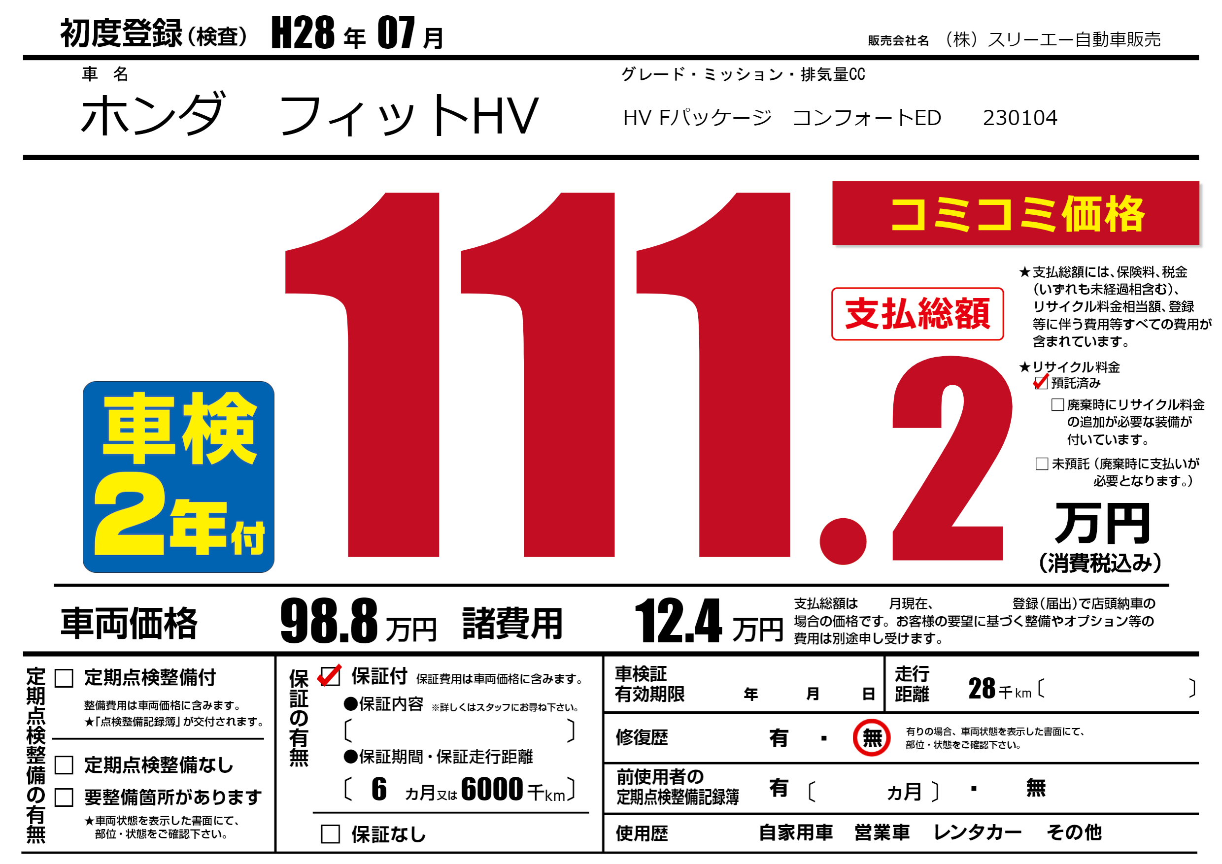 保証付き 保証内容(---) 6ヶ月または(6000)千kmまで |
