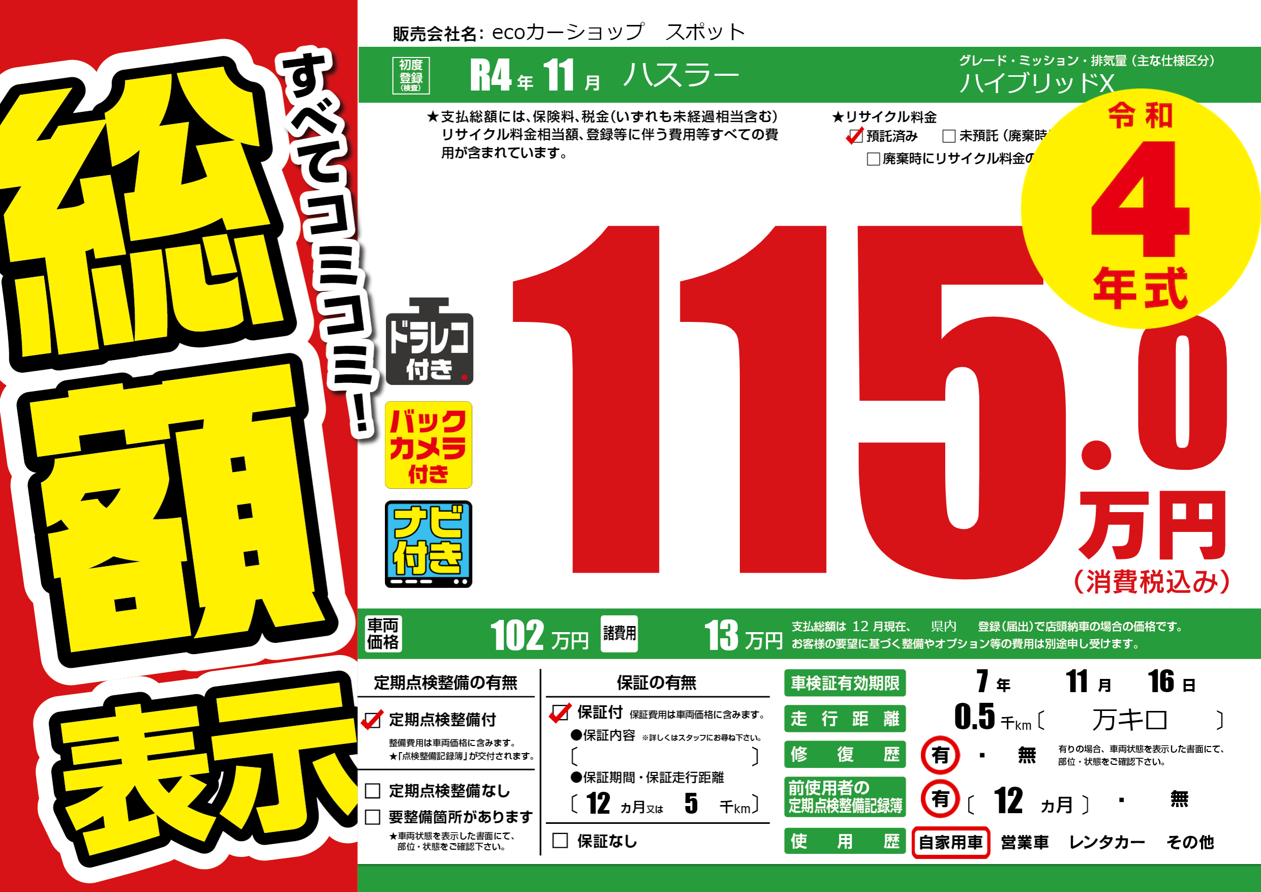 | 車名 | ハスラー | グレード ミッション 排気量 |