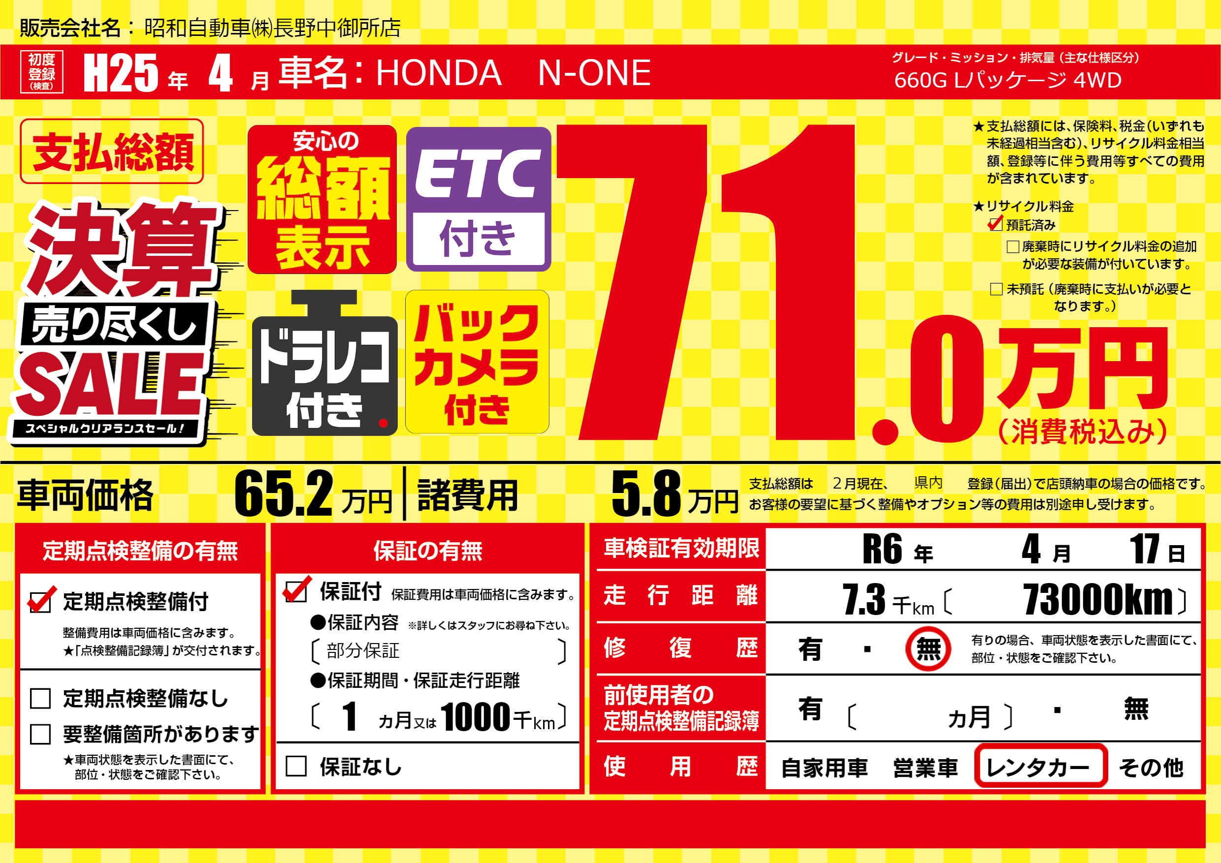 | 車名 | HONDA N-ONE | グレード ミッション 排気量 |