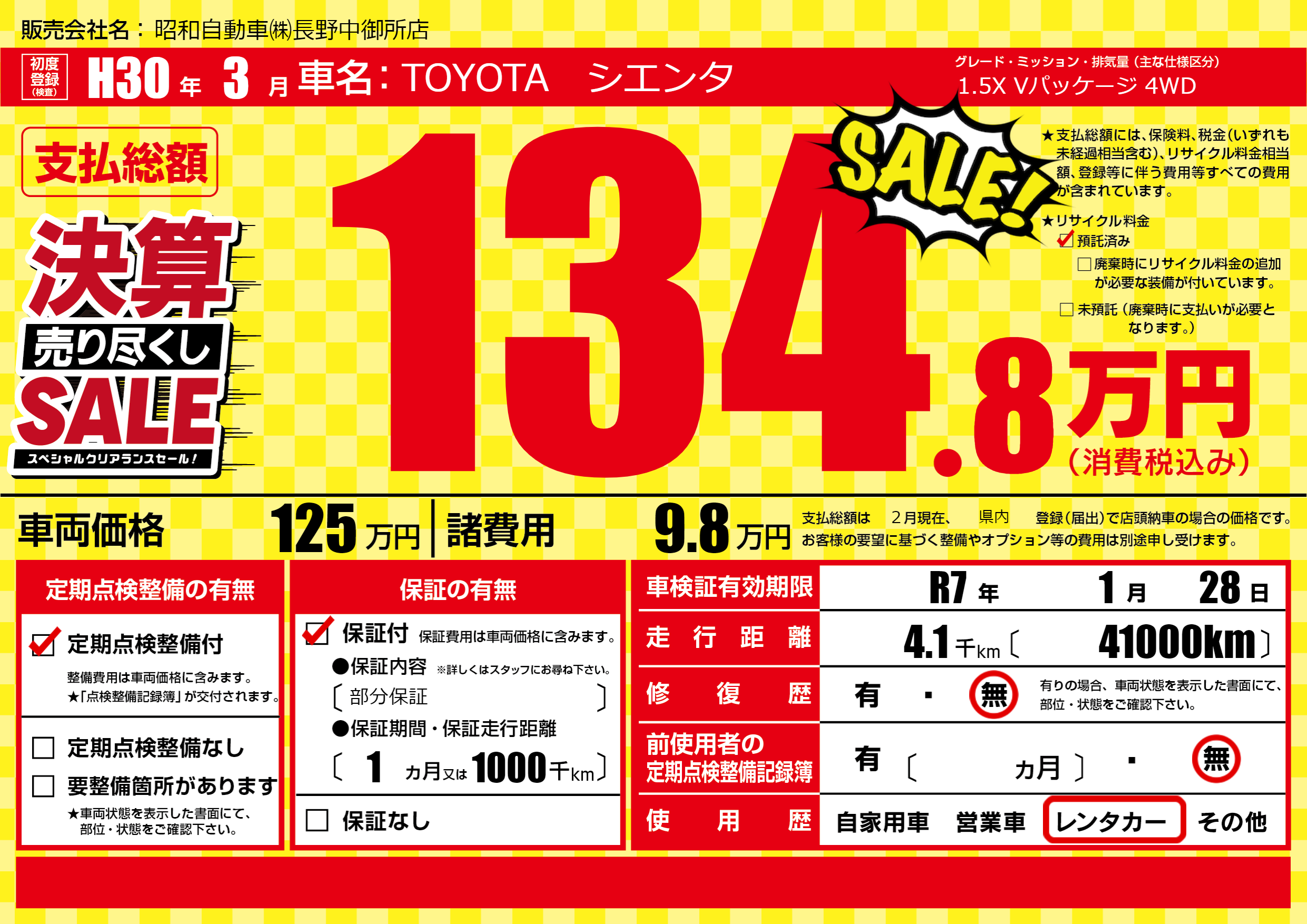 | 車名 | TOYOTA シエンタ | グレード ミッション 排気量 |