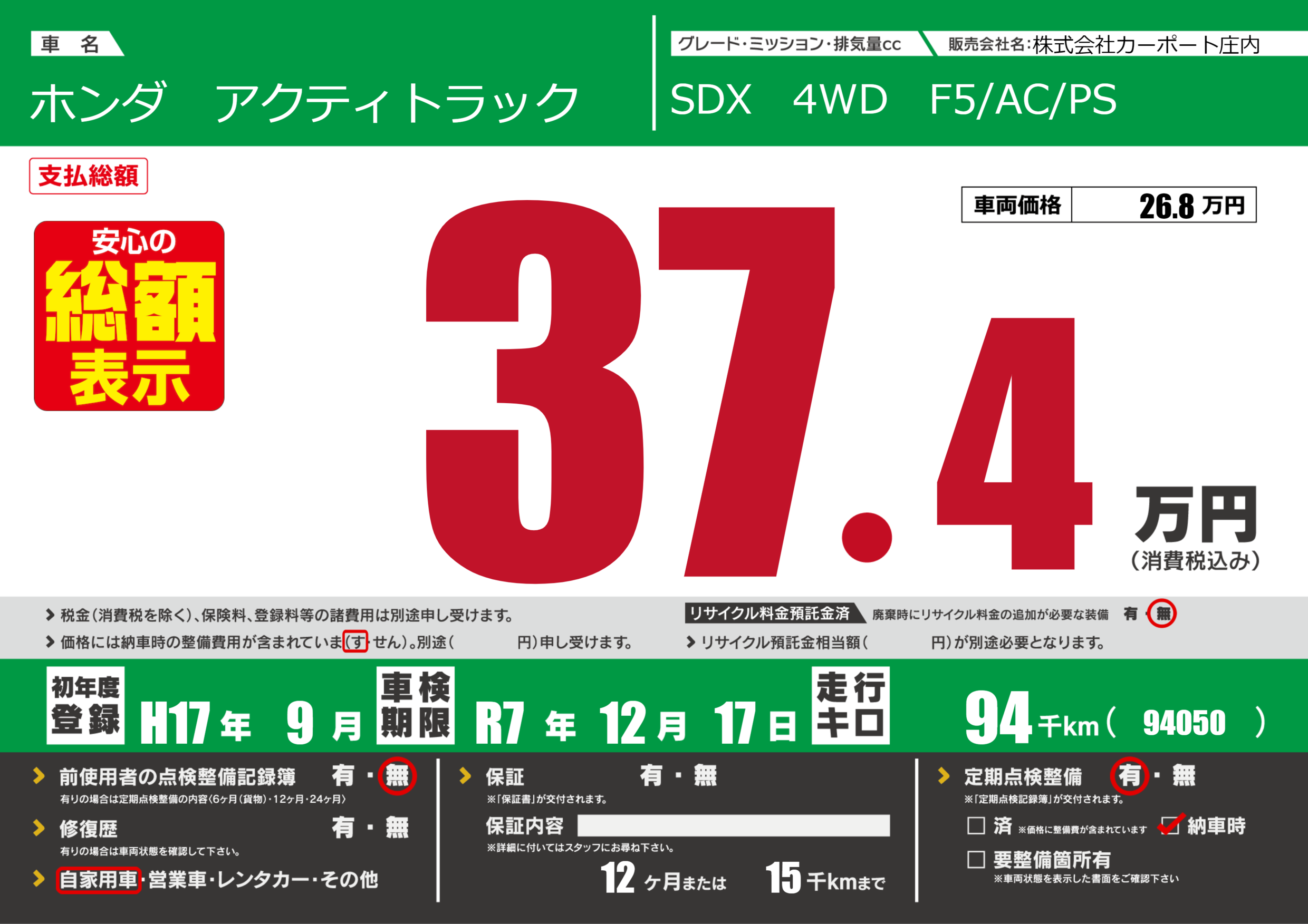 | 定期点検整備 | 定期点検整備あり 納車時あり | ||