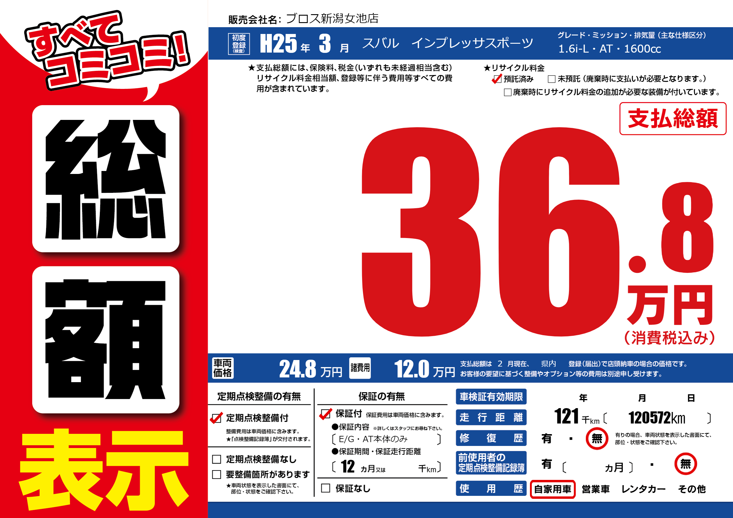 | 車名 | スバル インプレッサスポーツ | グレード ミッション 排気量 |