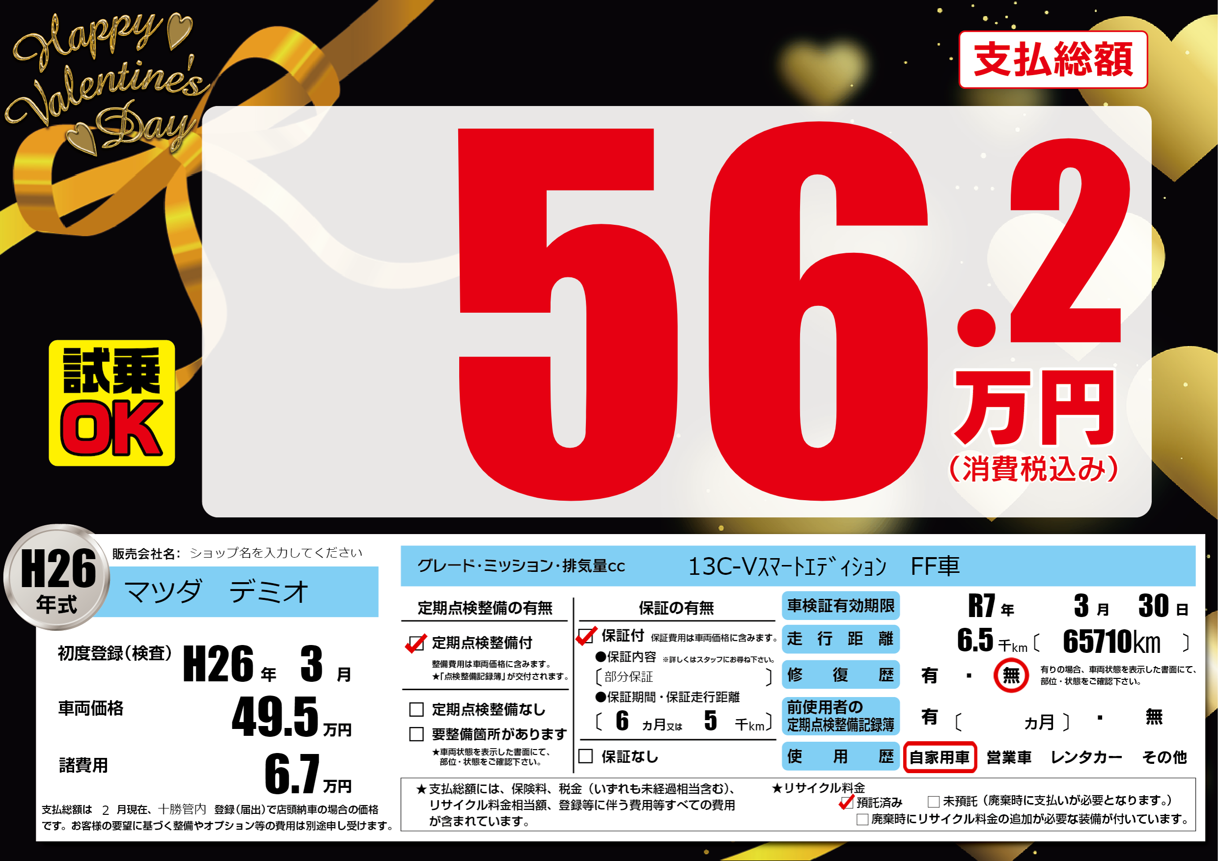 | 走行キロ | 0.6万km | 初年度登録 | H26年3月 |
