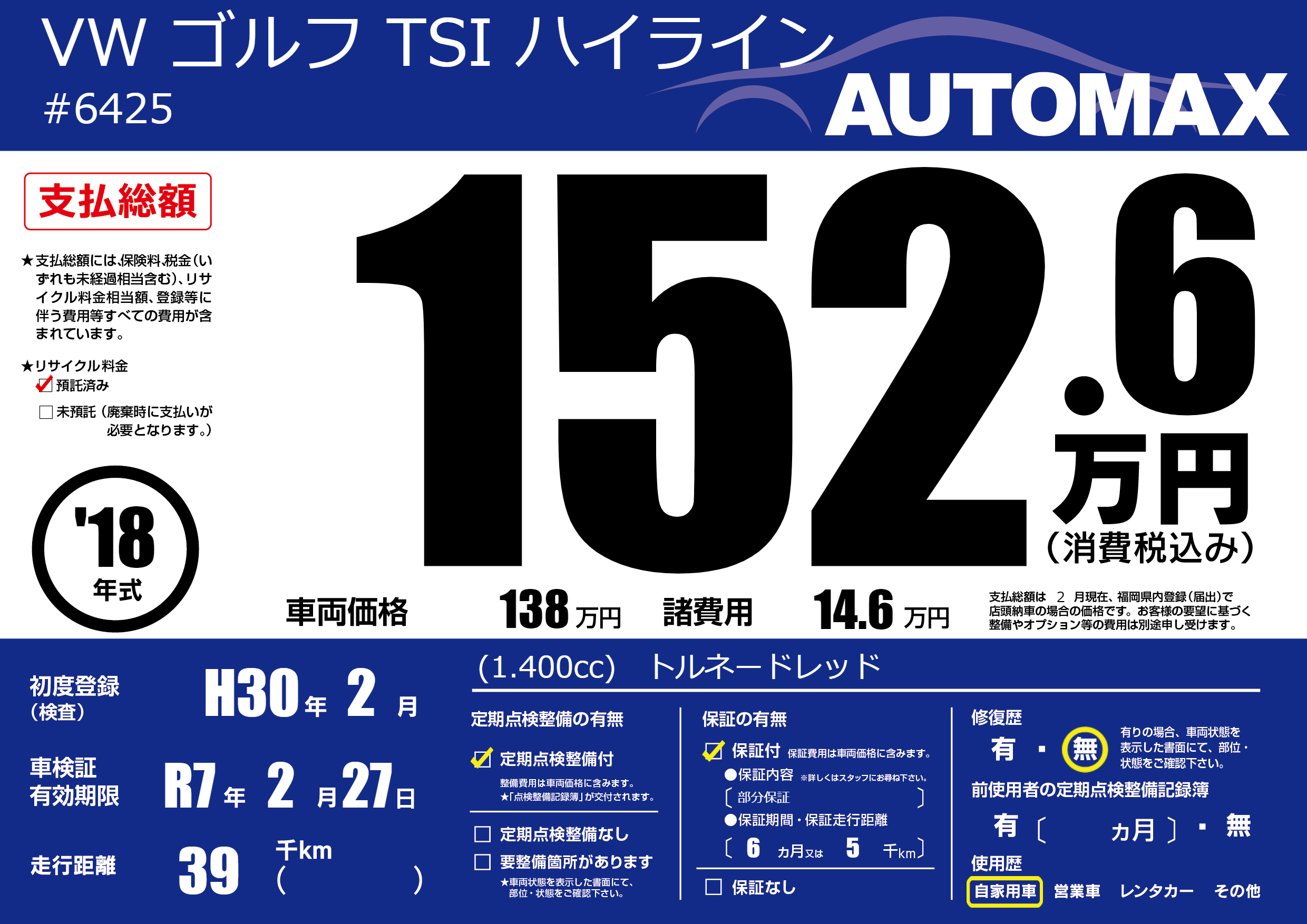 | 車名 | VW ゴルフ TSI ハイライン | グレード ミッション 排気量 |