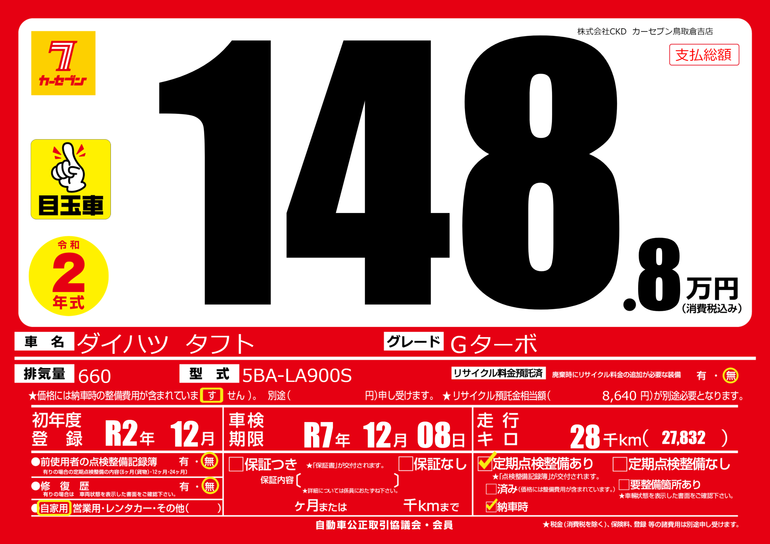 | 走行キロ | 2.8万km | 初年度登録 | R2年12月 |