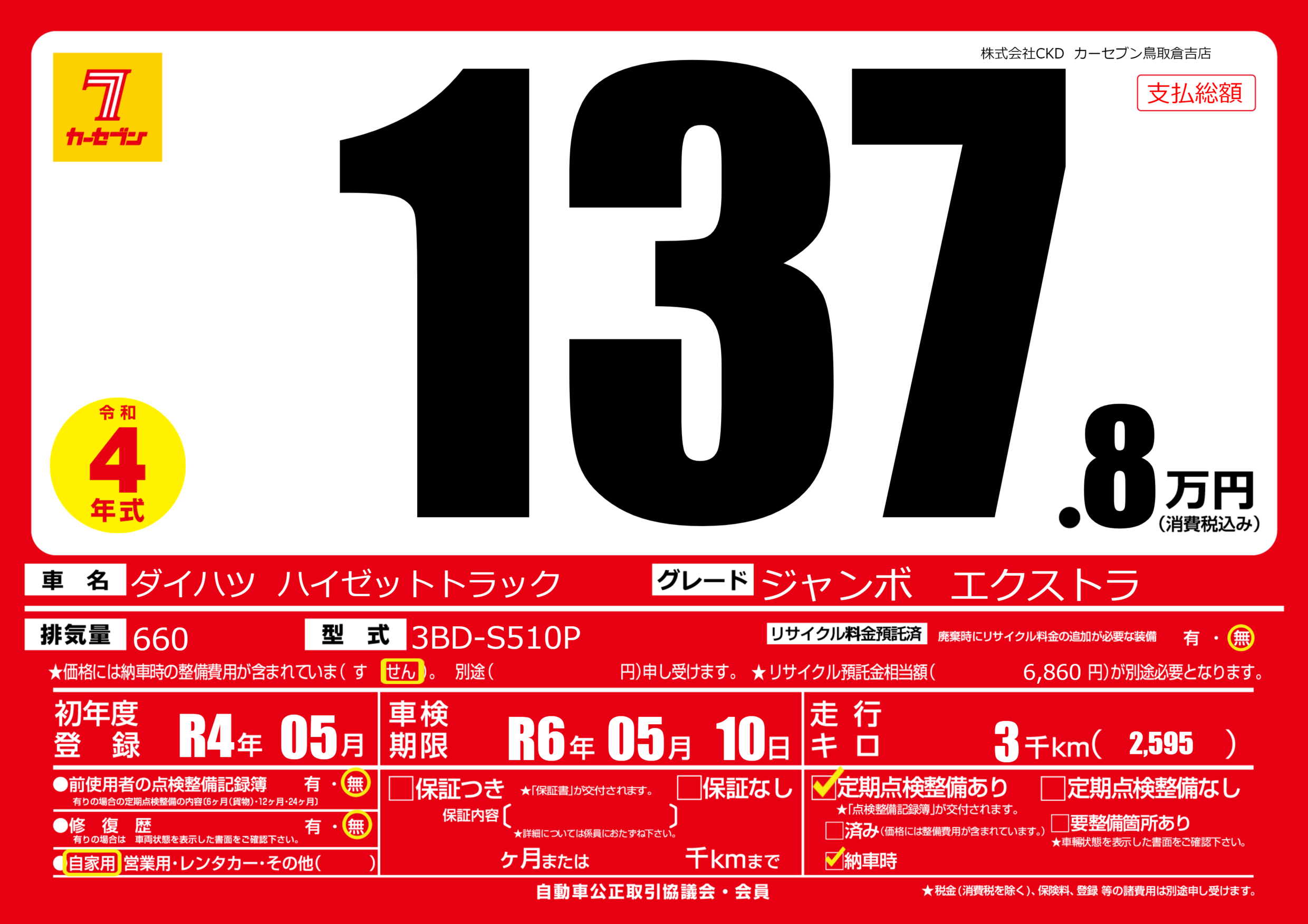 | 定期点検整備 | 定期点検整備あり 納車時あり | ||