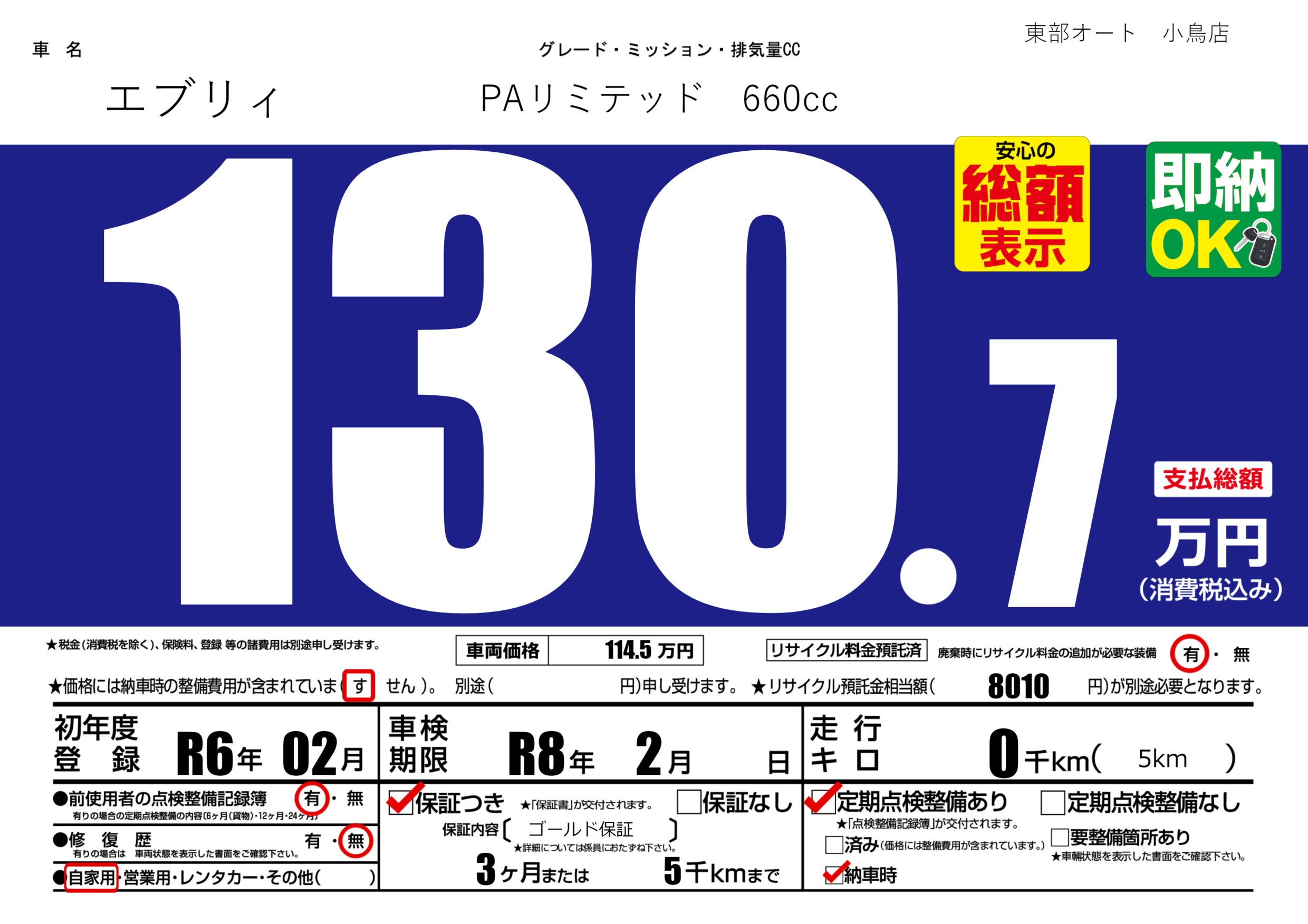 | 車検制限 | R8年 2月 - 日 | ||