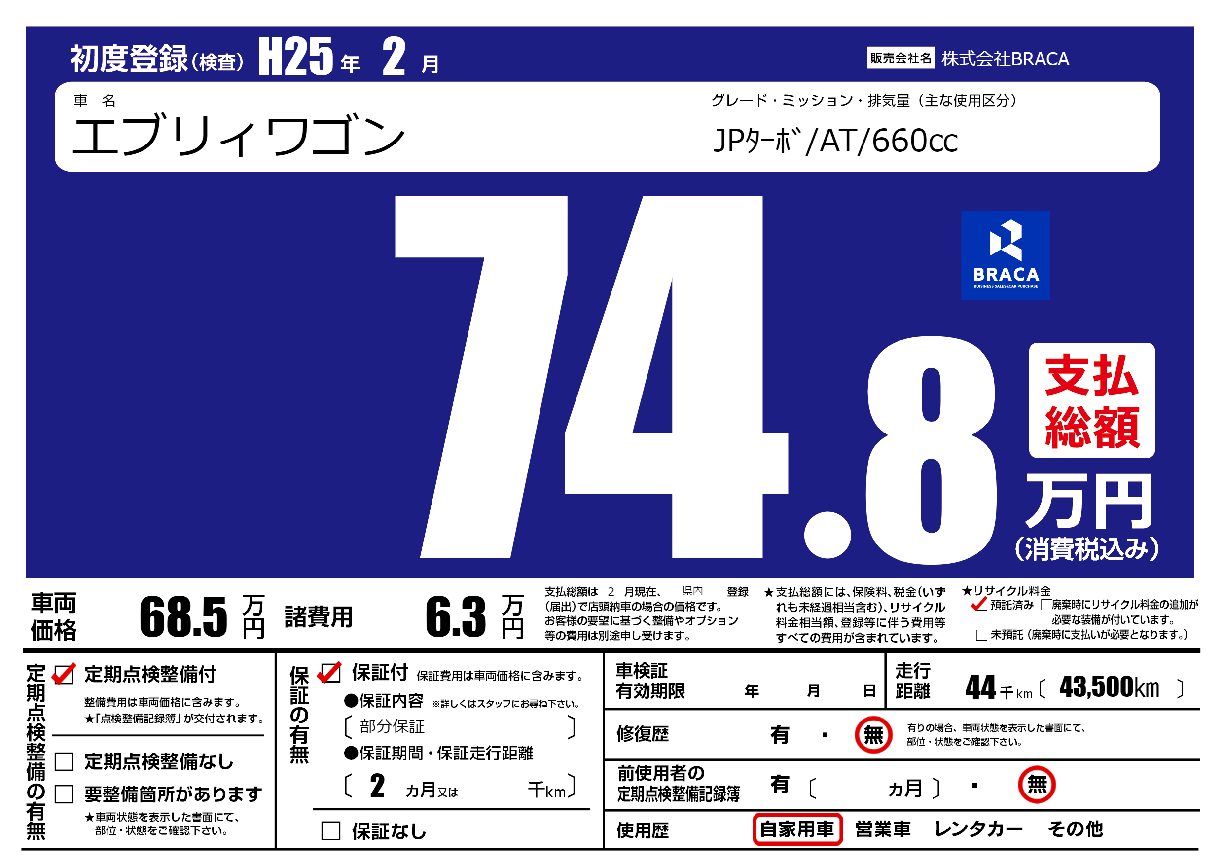 | 走行キロ | 4.4万km | 初年度登録 | H25年2月 |