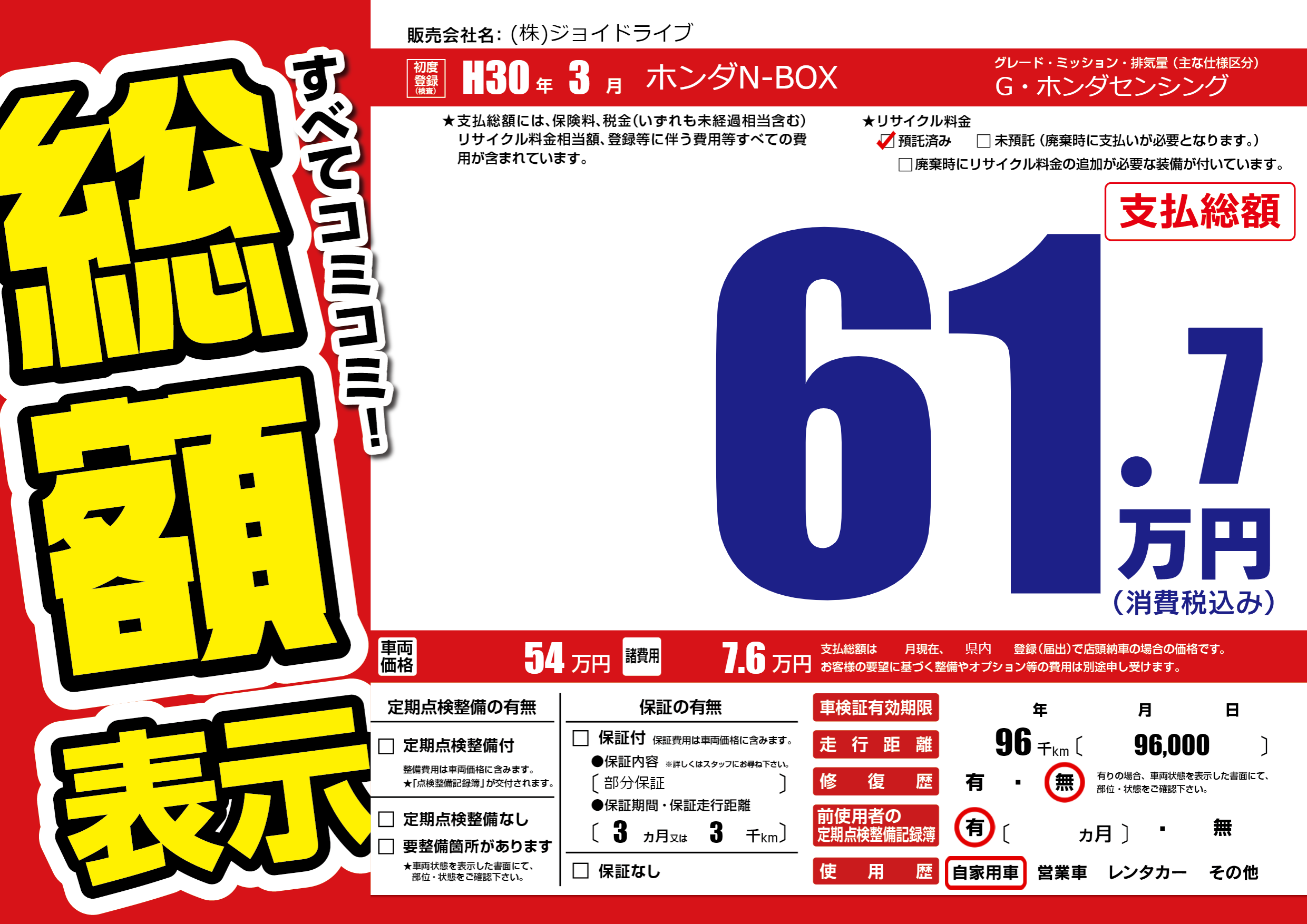 | 走行キロ | 9.6万km | 初年度登録 | H30年3月 |