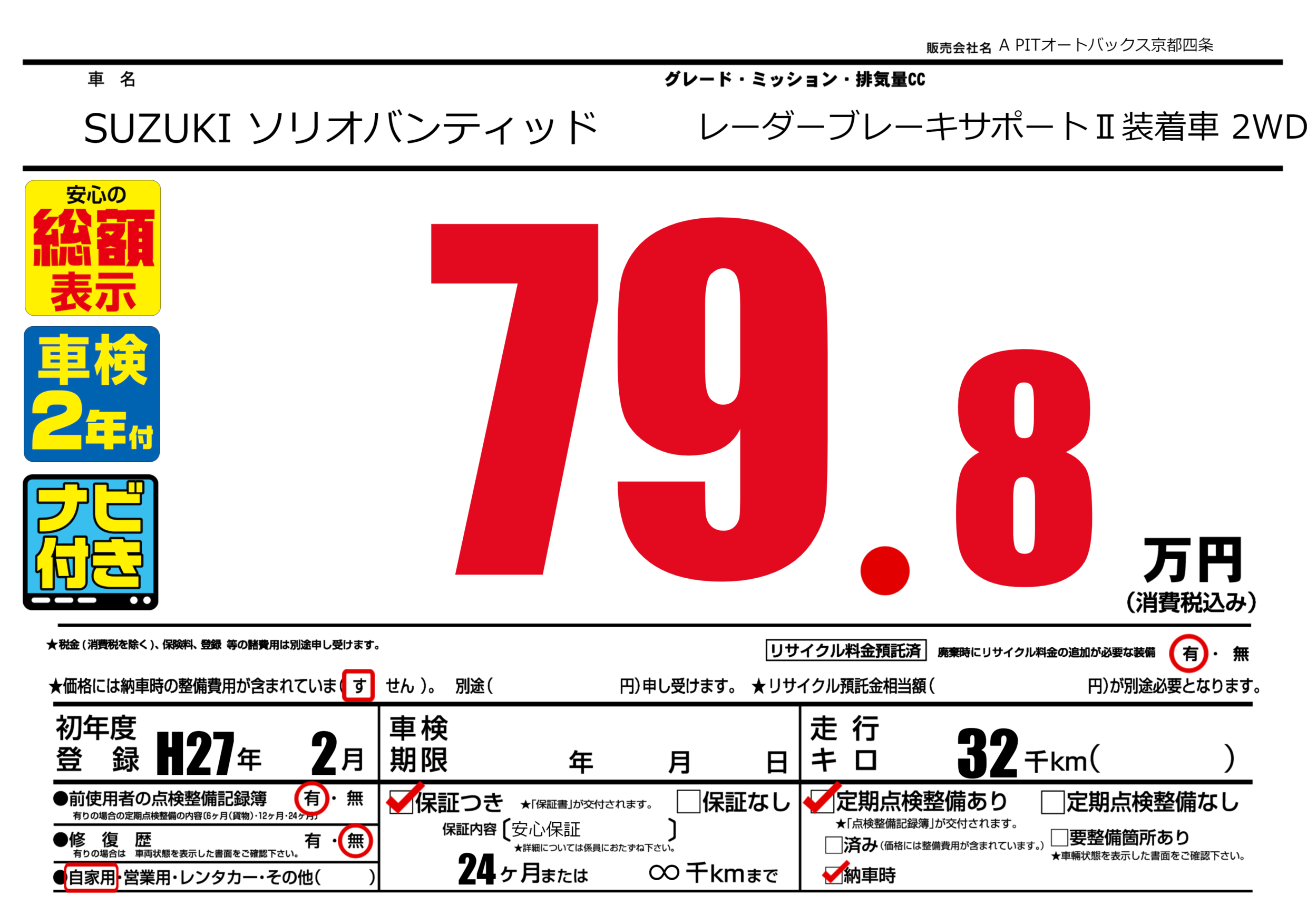 | 定期点検整備 | 定期点検整備あり 納車時あり | ||