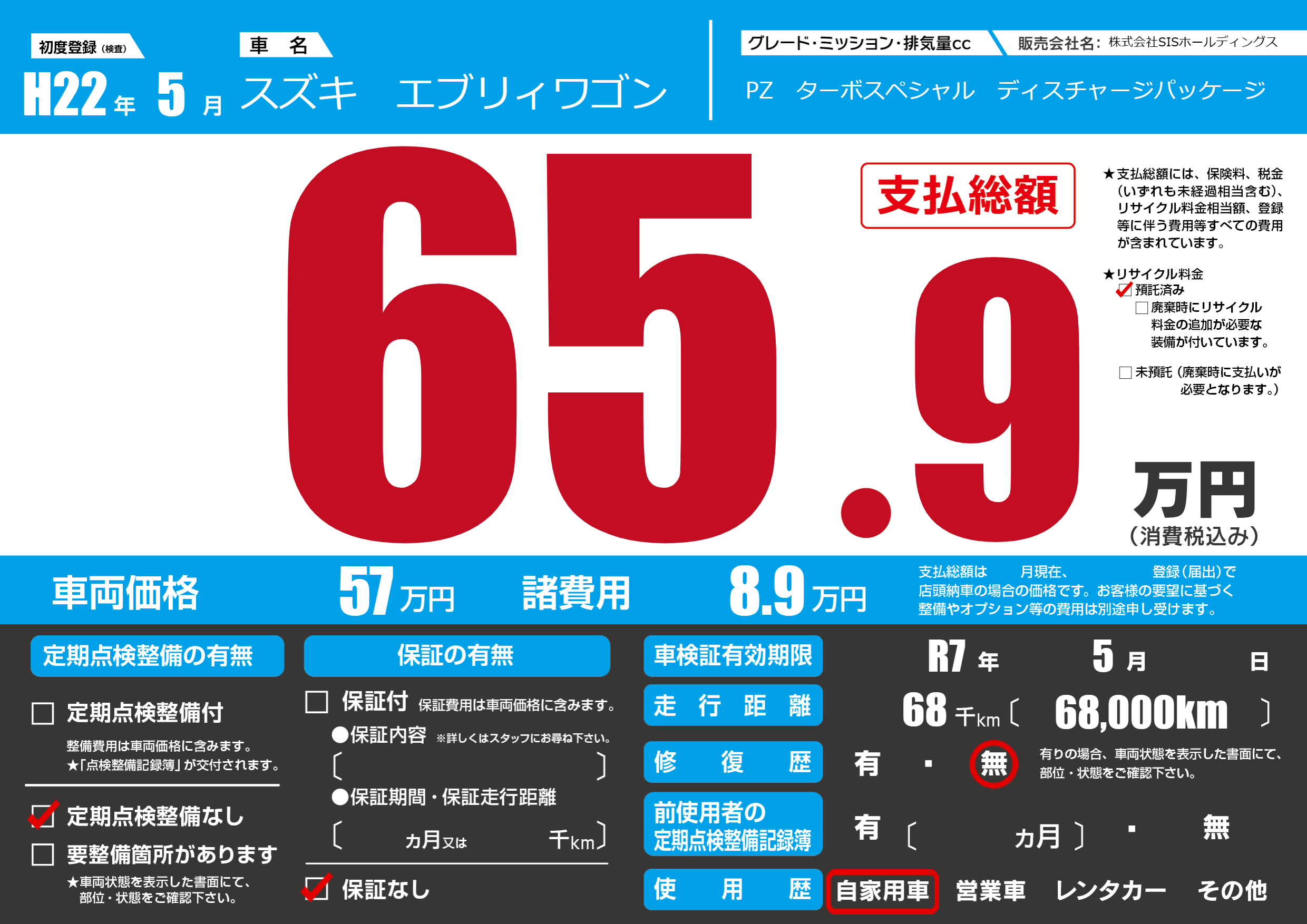 | 車名 | スズキ エブリィワゴン | グレード ミッション 排気量 |