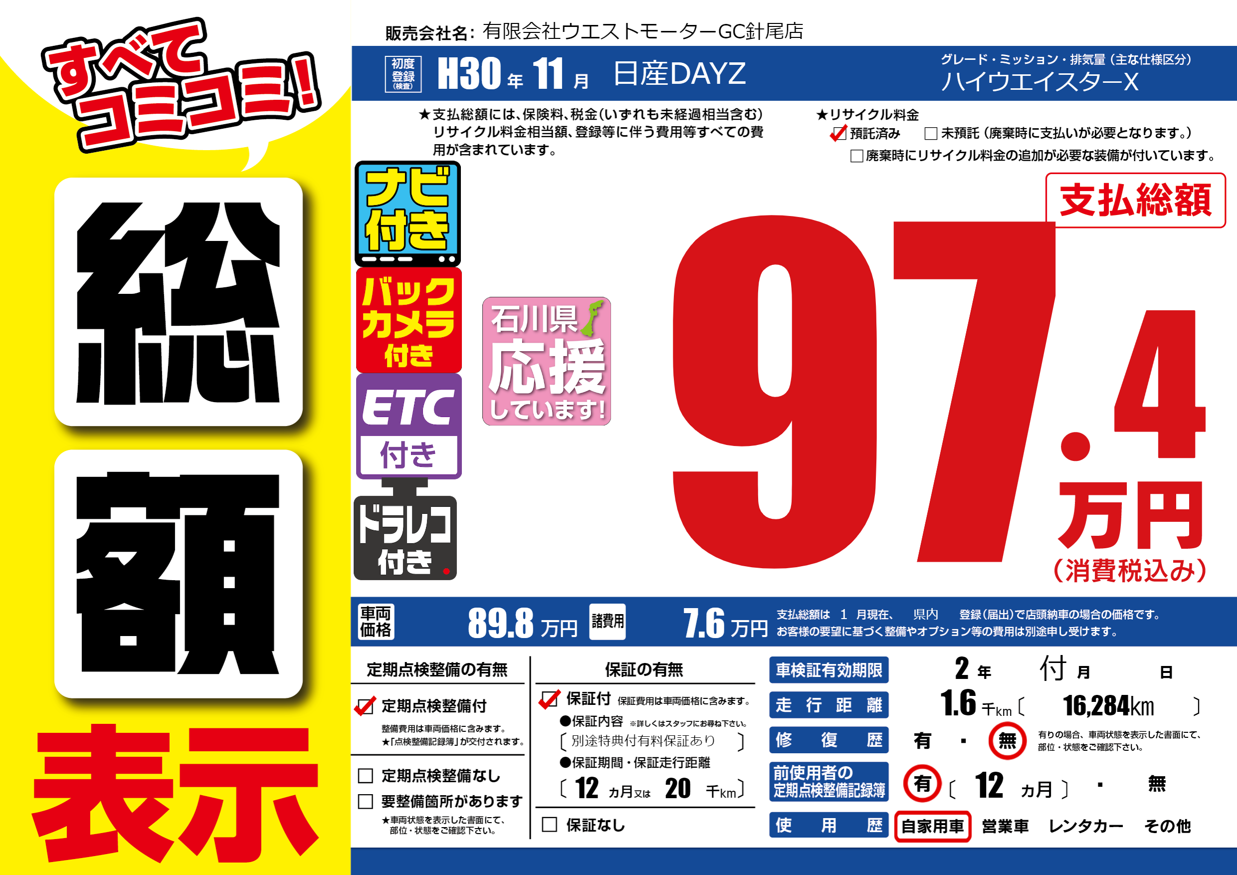 | 走行キロ | 0.1万km | 初年度登録 | H30年11月 |