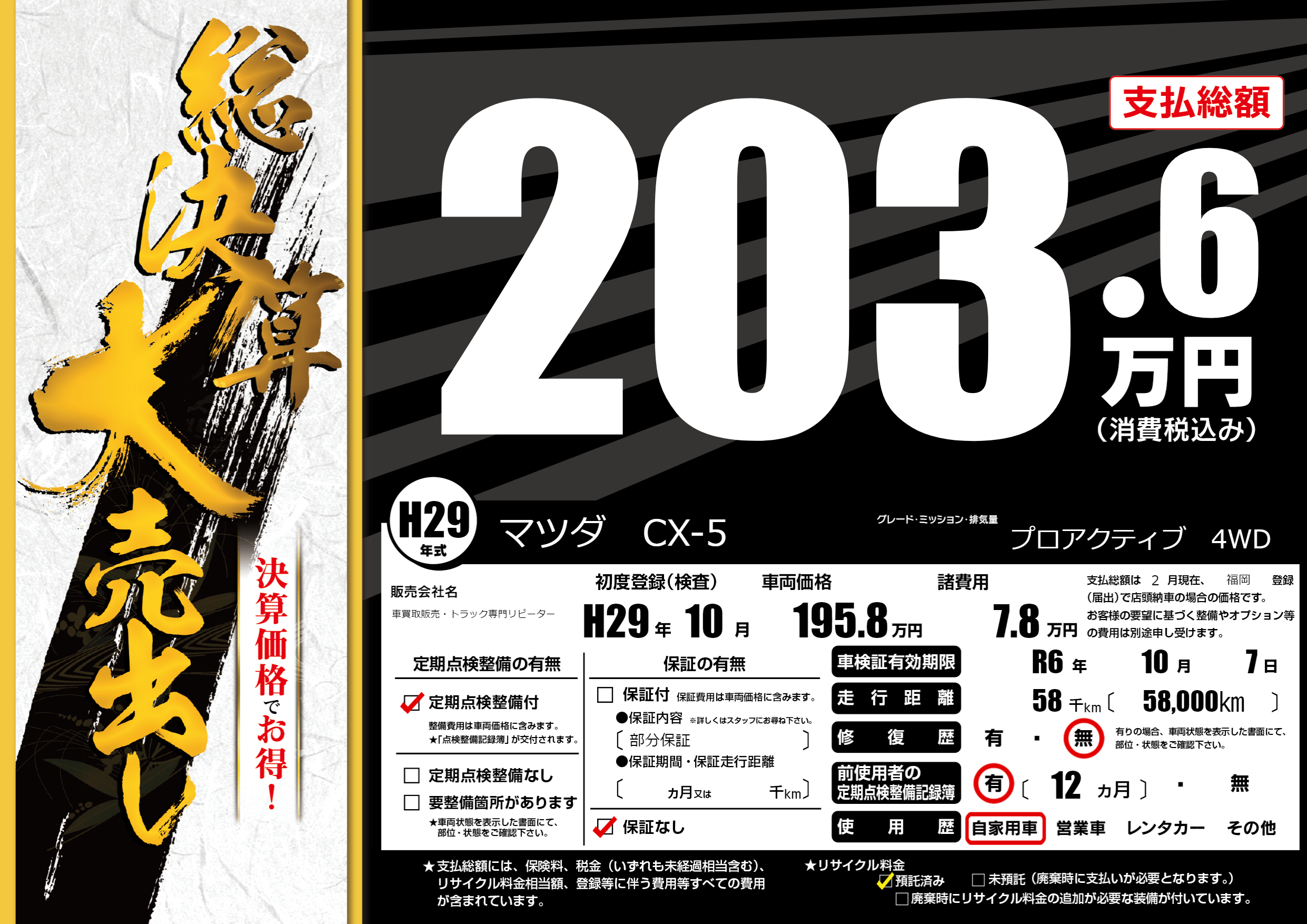 | 車名 | マツダ CX-5 | グレード ミッション 排気量 |