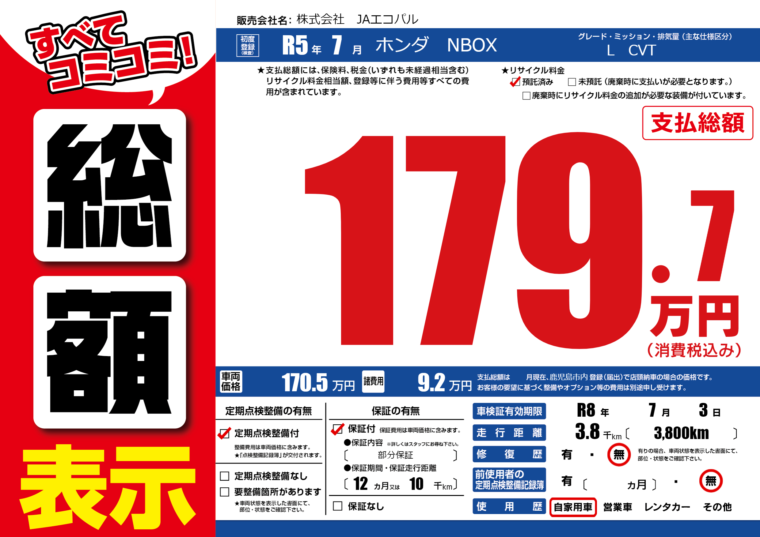 | 走行キロ | 0.3万km | 初年度登録 | R5年7月 |