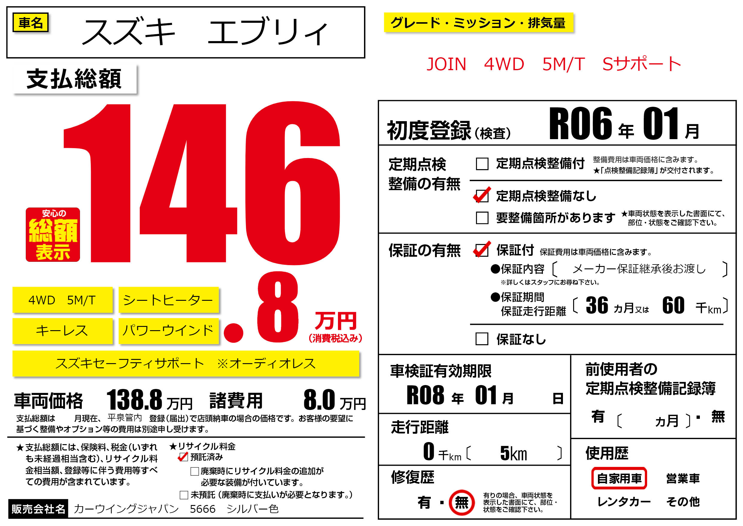 | 車検制限 | R08年 01月 - 日 | ||