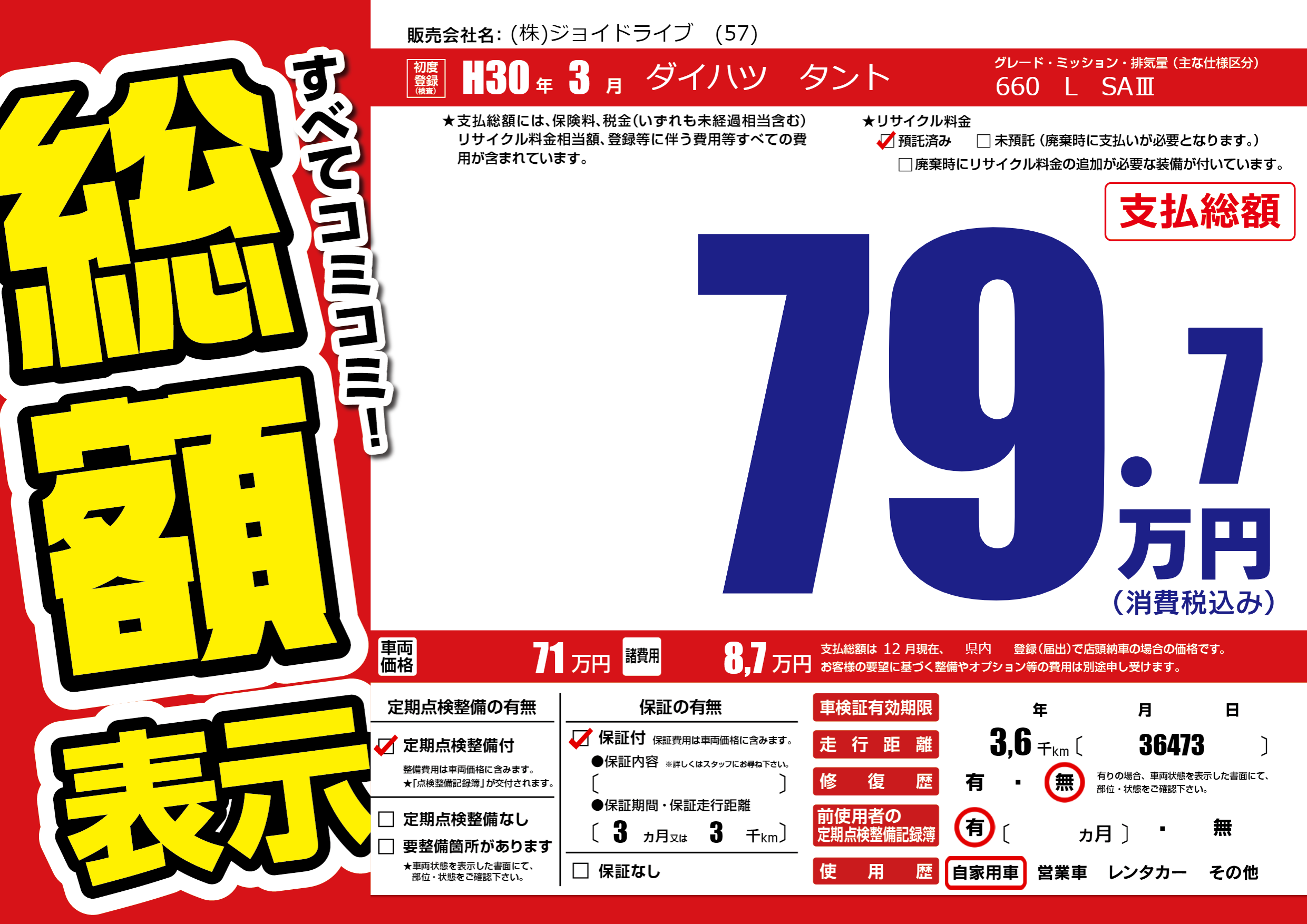 | 車名 | ダイハツ タント | グレード ミッション 排気量 |