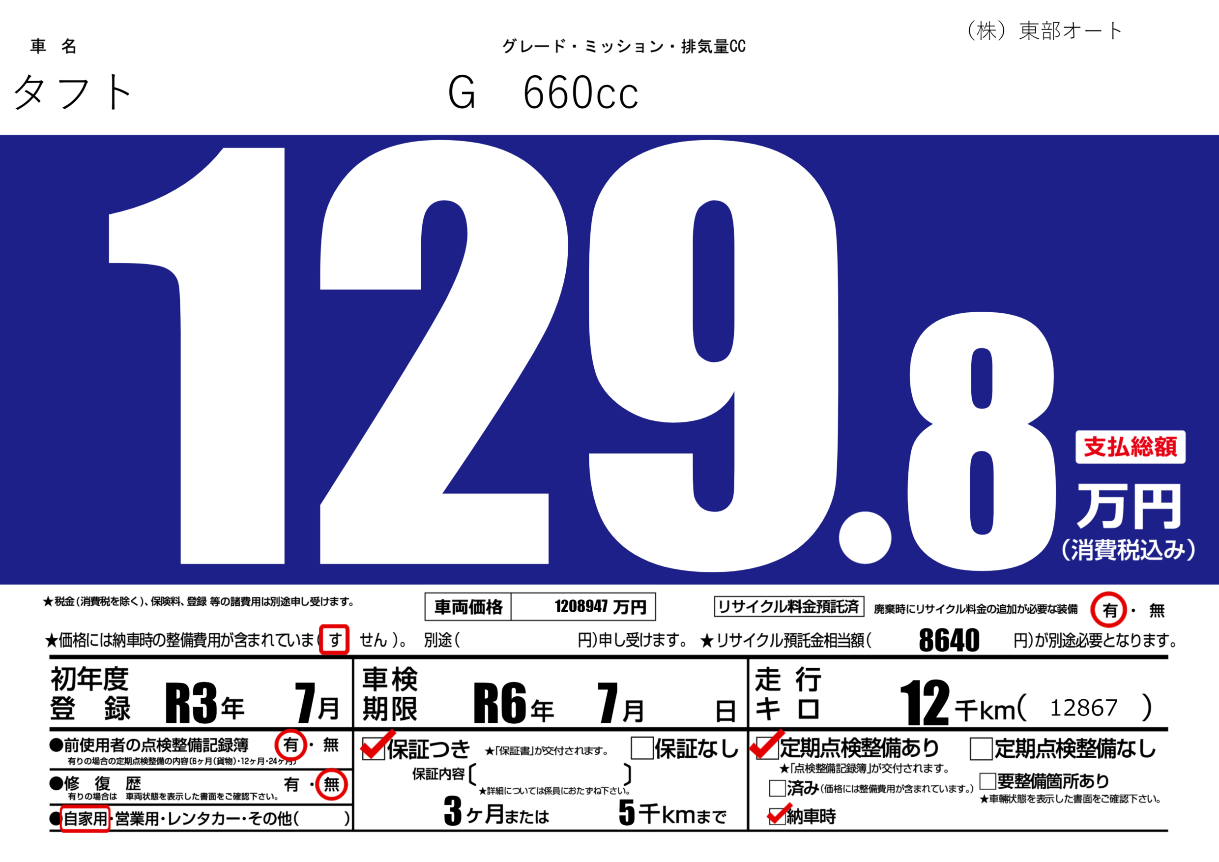 | 定期点検整備 | 定期点検整備あり 納車時あり | ||