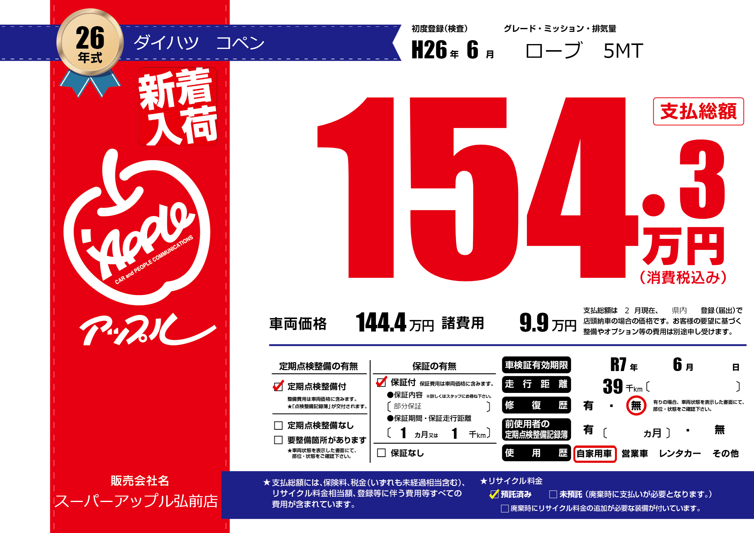 あり | リサイクル預託金相当額 | ( 0円)が別途必要 |