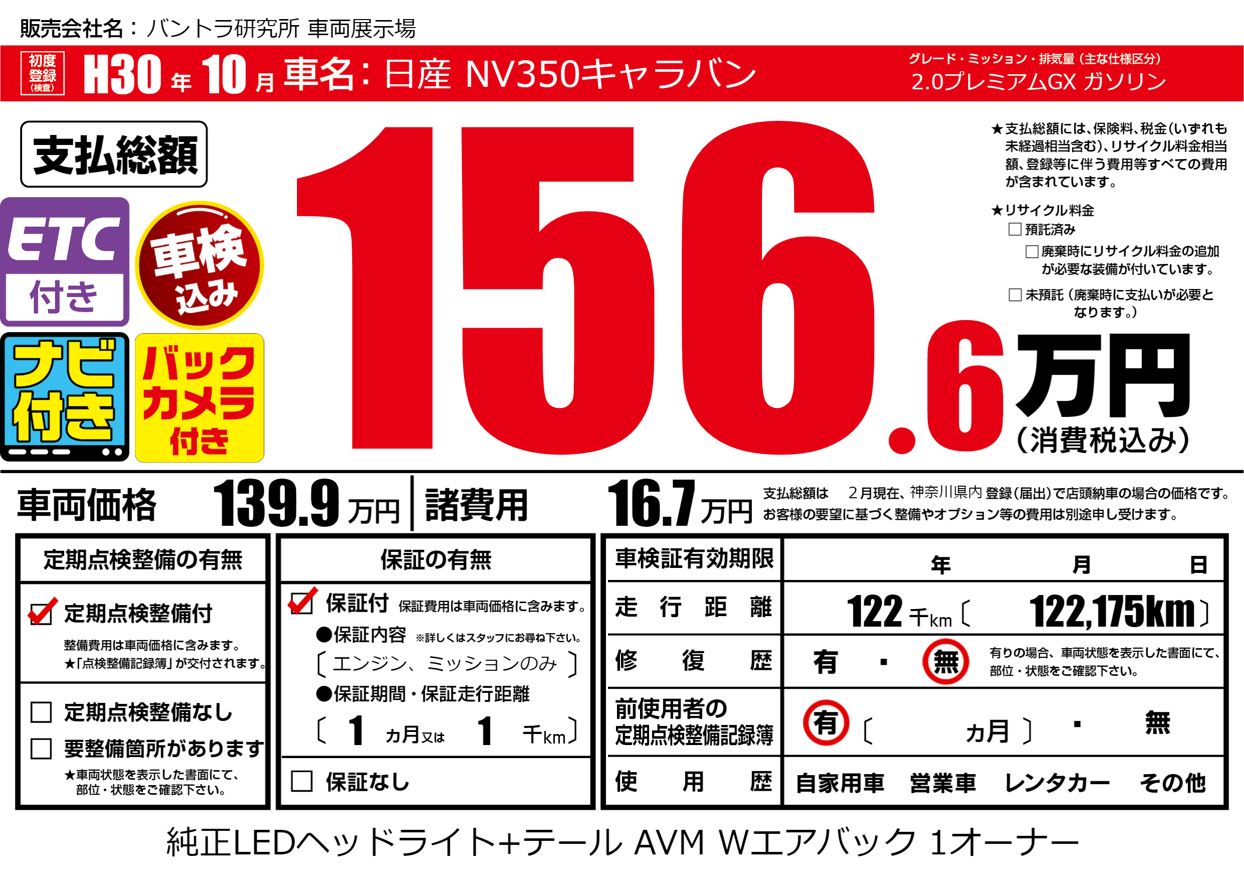 | 車名 | 日産 NV350キャラバン | グレード ミッション 排気量 |