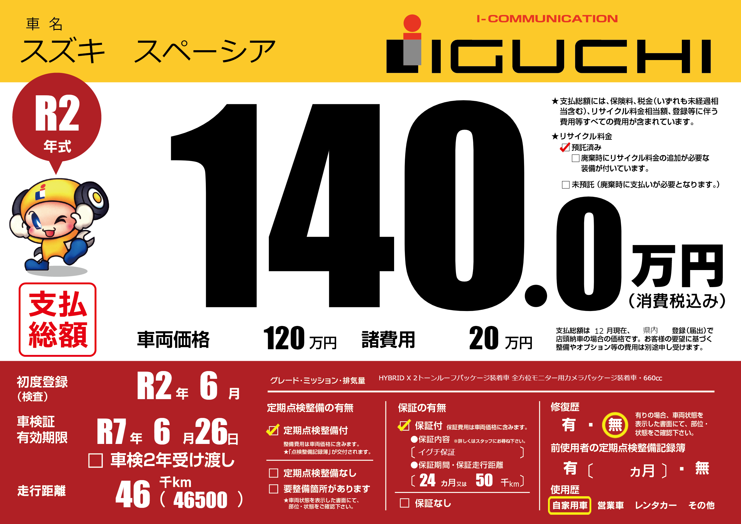 保証付き 保証内容(イグチ保証) 24ヶ月または(50)千kmまで |