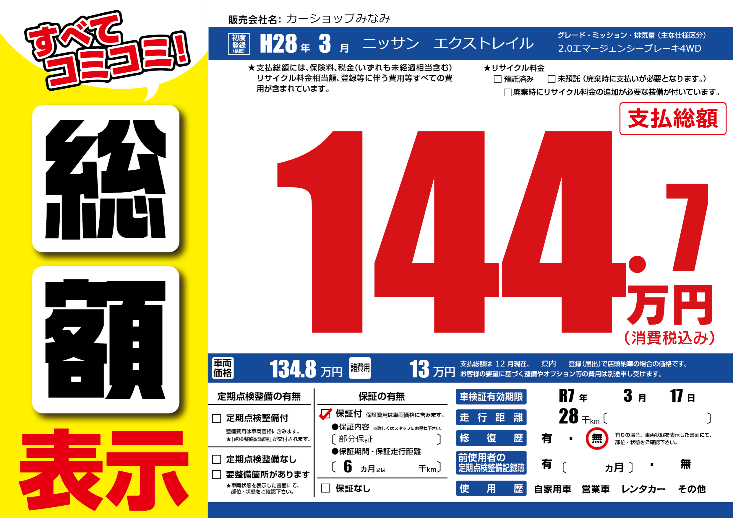 | 車名 | ニッサン エクストレイル | グレード ミッション 排気量 |