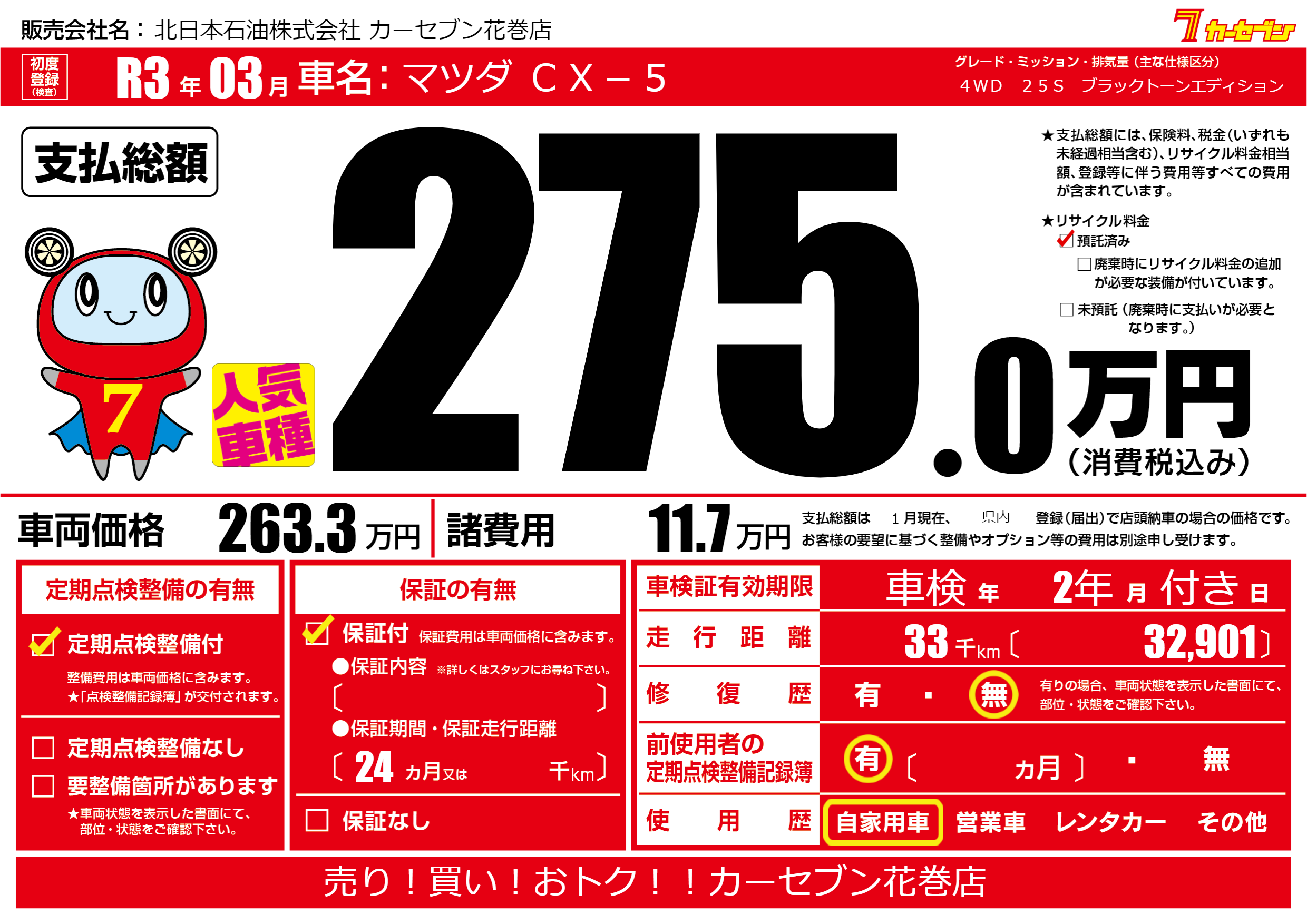 | 走行キロ | 3.3万km | 初年度登録 | R3年03月 |