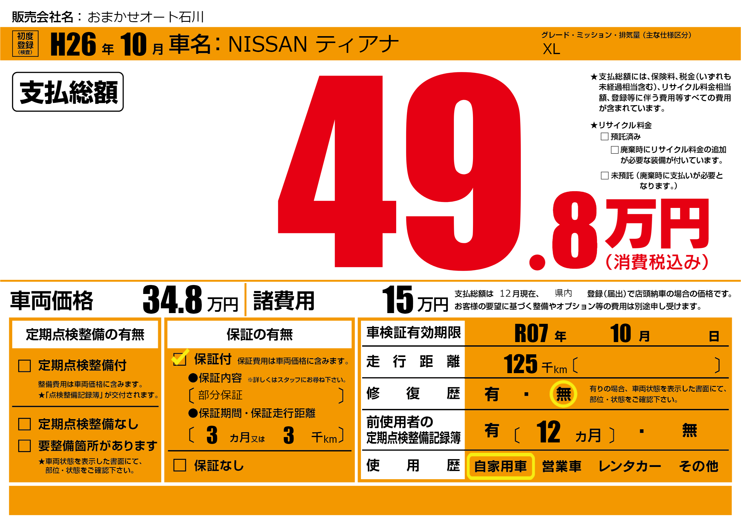| 走行キロ | 12.5万km | 初年度登録 | H26年10月 |