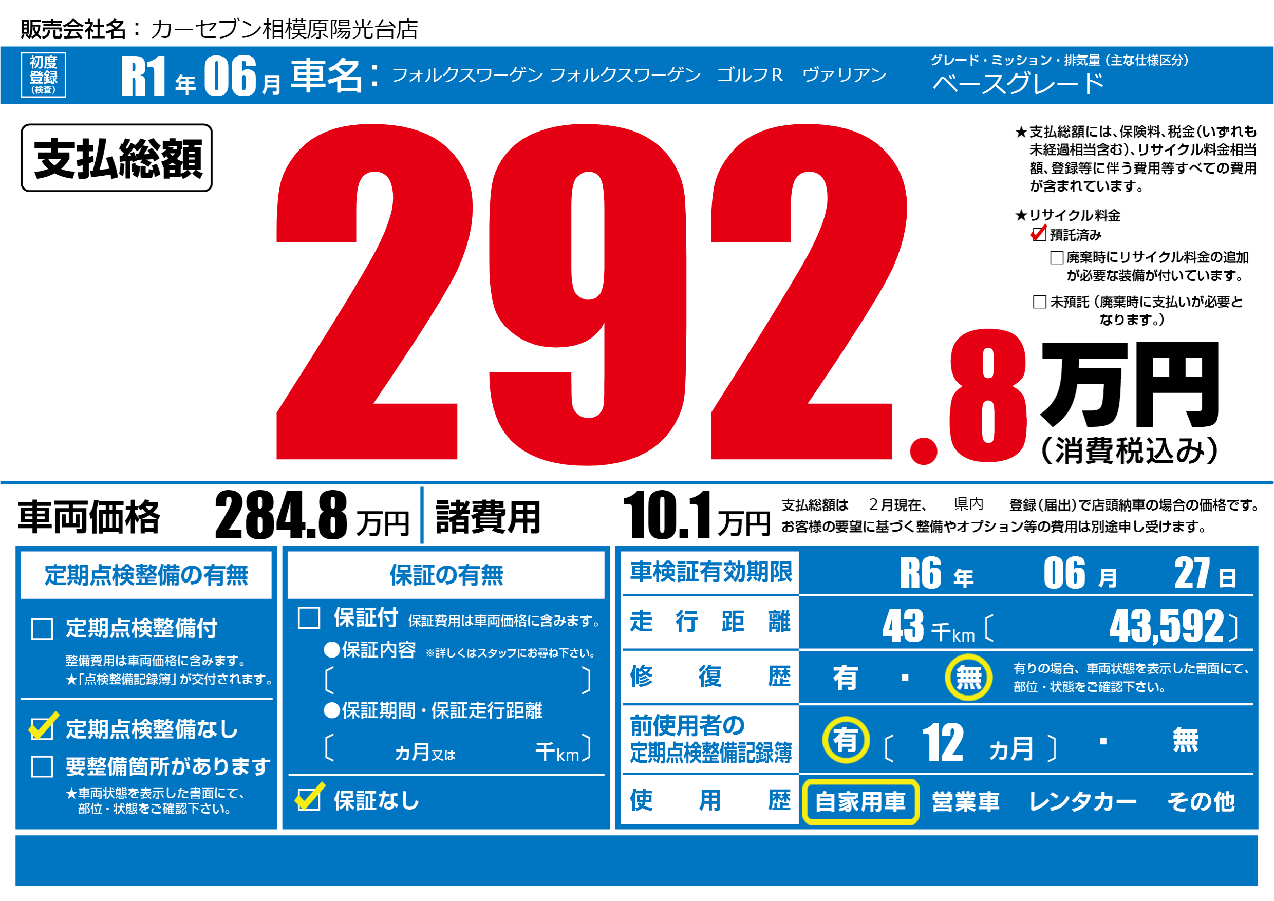 | 車名 | フォルクスワーゲン フォルクスワーゲン ゴルフR ヴァリアン | グレード ミッション 排気量 |