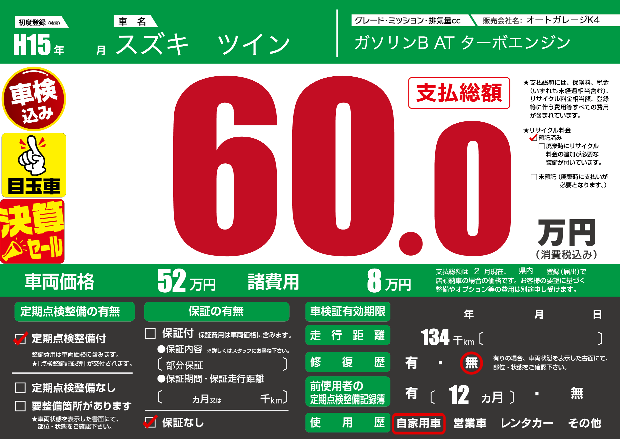 保証なし 保証内容(部分保証) ---ヶ月または()千kmまで |