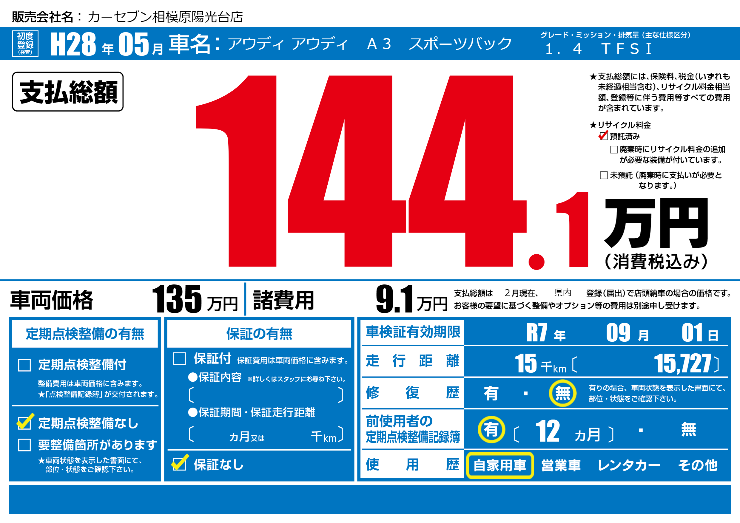 | 車名 | アウディ アウディ A3 スポーツバック | グレード ミッション 排気量 |
