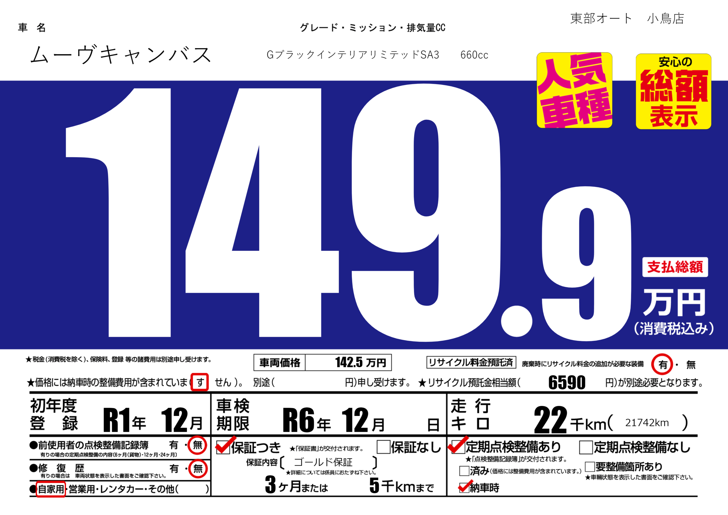 保証付き 保証内容( ゴールド保証) 3ヶ月または5千km |
